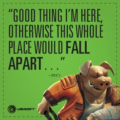 El que ahí veis es Pey’j, uno de los personajes del citado videojuego, y el texto dice así en cuestión dice «Lo bueno es que estoy aquí, de lo contrario todo este lugar se vendría abajo … «