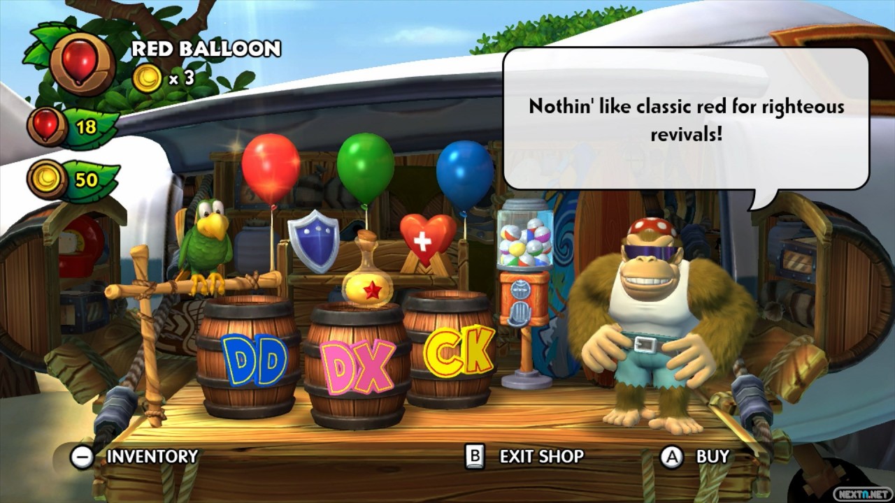 - Podremos comprar vidas extras, objetos, compañeros y la ayuda del loro Squawks en la Agencia de Vuelos de Funky y tiendas de compra.