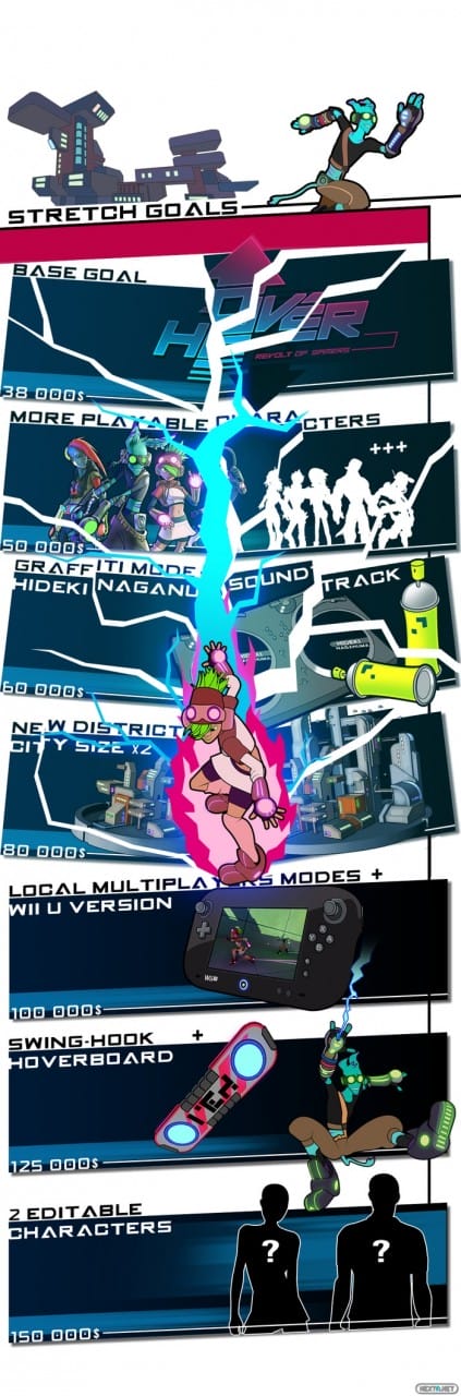 Aquella meta de 100.000 dólares parecía tan lejana… Y sin embargo, Hover: Revolt Of Gamers no ha tenido mayor problema para ir sobrepasando objetivo tras objetivo de su campaña Kickstarter, hasta confirmar una versión específica para Wii U de esta prometedora mezcla de Jet Set Radio y Mirror’s Edge.