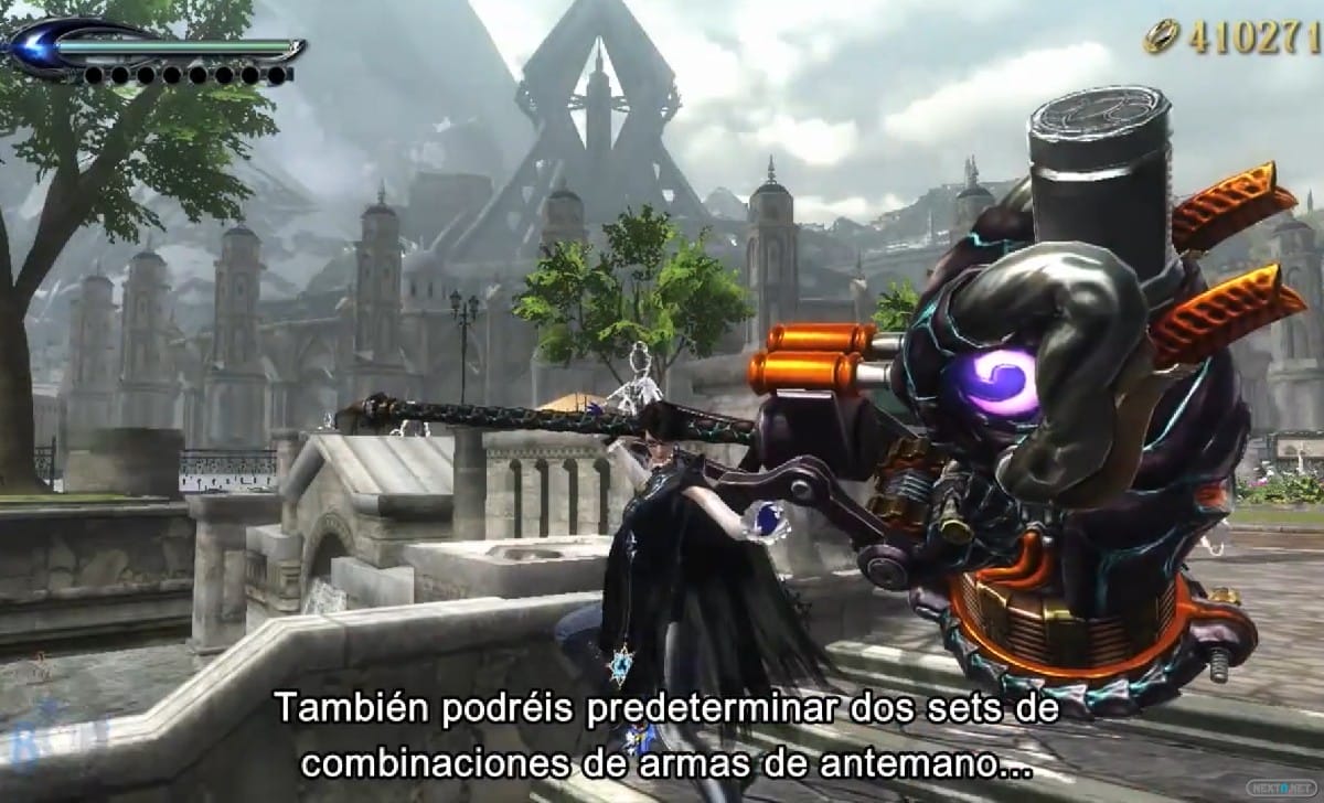 En cuanto a los accesorios, los hay que mejoran los ataques, como un anillo que nos permite invocar a un pequeño grupo de cabezas voladoras con guadañas. También los hay de protección, y el ejemplo mostrado en la presentación son unas mariposas que se ponen delante nuestra para recibir los impactos. Además, podremos comprar nuevas habilidades para Bayonetta, como la «Patada After Burner», el «Espaldarazo».