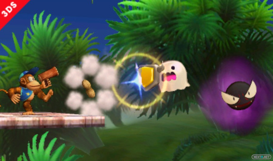 «Foto del día. Estos dos son una pareja inquietante. Sólo podrás atacar a Gastly utilizando objetos, pero el Fantasma tiene una guardia perfecta y refleja tus ataques. Cuando veas a un fantasma, asegúrate de utilizar tu agarre. Si juegas como Diddy Kong, también debería irte bien su Cabriola Simiesca [movimiento llamado Monkey Flip en la versión inglesa].»