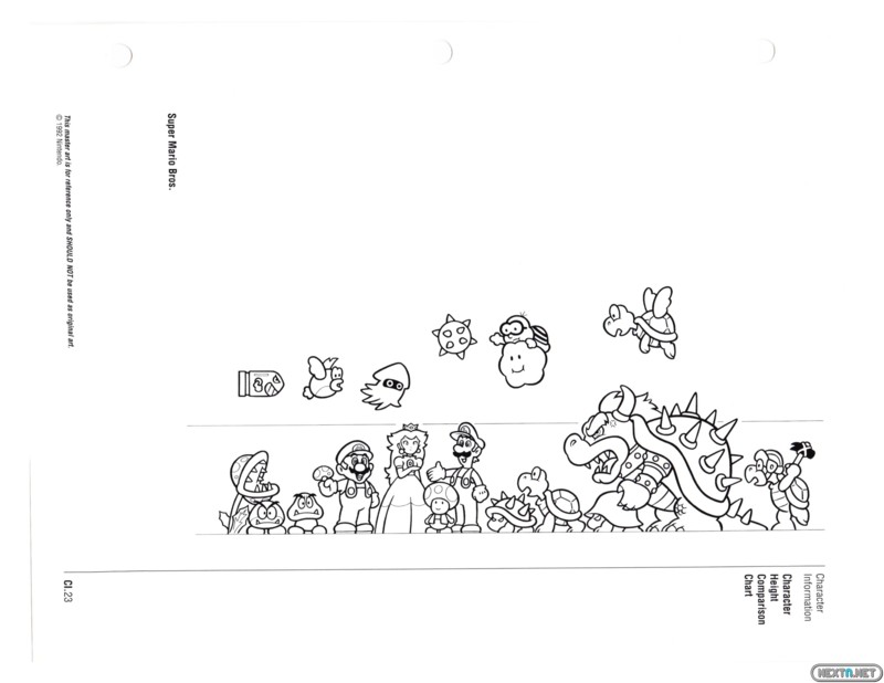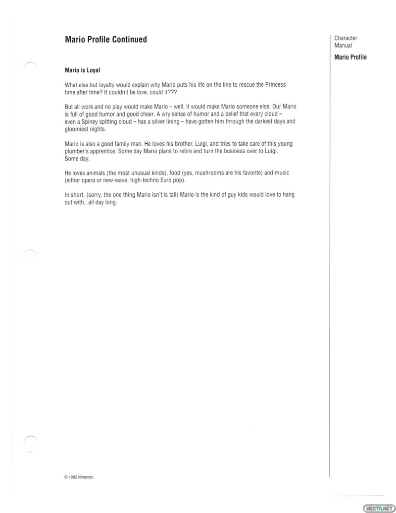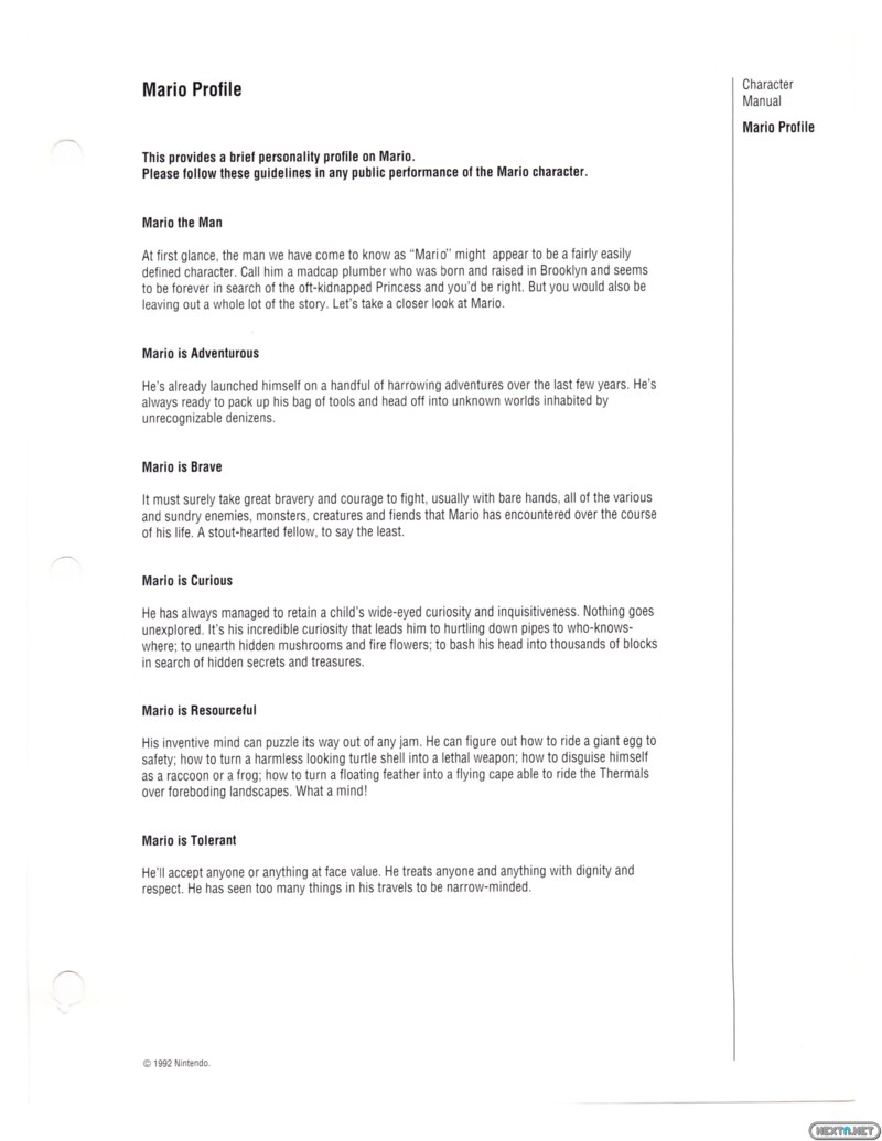 Este documento, que hoy sale a la luz gracias a la web Press the Buttons, muestra todo tipo de curiosidades que afectan a la representación de los icónicos componentes de las franquicias de Nintendo, incluso curiosas reseñas sobre su biografía y otros elementos de su contexto. Por ejemplo, ¿sabíais que la primera hazaña fontaneril de Mario fue arreglar una pistola de agua de un amigo? ¿o que Yoshi nunca podía aparecer mirando hacia la derecha en las ilustraciones?