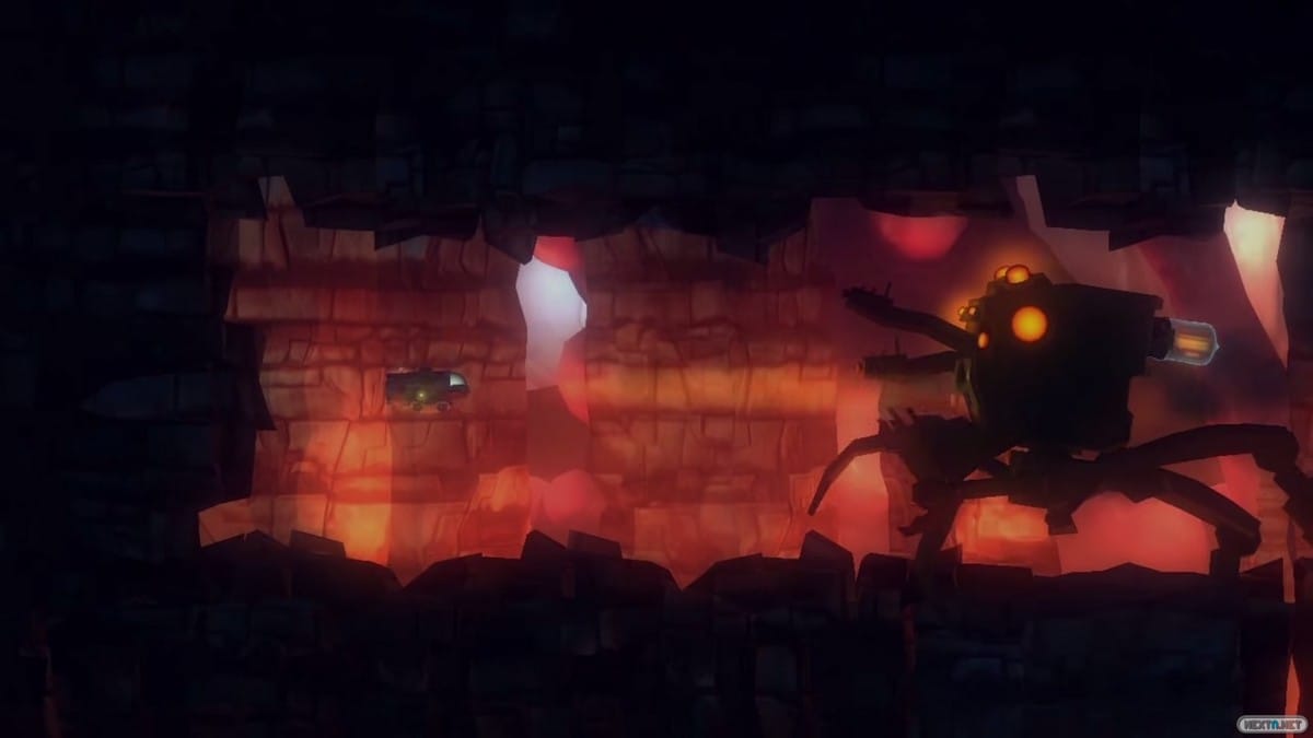 También habrá que combatir contra las inclemencias del planeta, y es que Spectaculon no es tan bucólico como nos lo presentaron en la agencia de viajes. Los escenarios van de oscuras cavernas a infiernos industriales, parajes poco románticos pero de una singular belleza gracias a un acabado artístico parco en detalles pero con colores muy expresivos. Todo esto rematado por efectos de luces y sombras no solo muy vistosos, sino utilizados con mucha cabeza para fortalecer la sensación de misterio y peligro que rodea el planeta. Y es que al final poco tiempo pasaremos explorando, pues se nos irá todo sobreviviendo a los constantes peligros que encontraremos en nuestra aventura. Peligros que debemos evitar exprimiendo tanto nuestra sesera como nuestra pericia a los mandos de Small Craft.