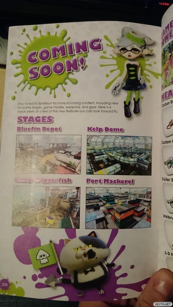 En esta segunda imagen podemos ver, con mayor o menor calidad, las primeras imágenes de los cuatro nuevos escenarios que llegarán vía descarga a Splatoon próximamente. A pesar de que esta información podría clasificarse de rumor han sido ya varios usuarios que han reportado que es una información autentica que se incluye en la guía oficial.