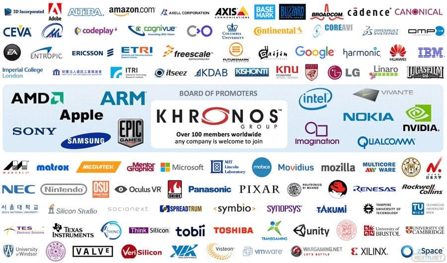 Khronos Group es una organización sin fines de lucro, un consorcio financiado por miembros que se centra en la creación de estándares abiertos libres de royaltis para computación paralela, gráficos y software dinámico en una amplia variedad de plataformas y dispositivos. Todos los miembros de Khronos son capaces de contribuir al desarrollo de las especificaciones de la API Khronos, están facultados para votar en las diversas etapas antes del lanzamiento de cara al público y son capaces de acelerar la entrega de sus aplicaciones y plataformas 3D de última generación a través de un acceso temprano a borradores de especificaciones y tests de conformidad.»