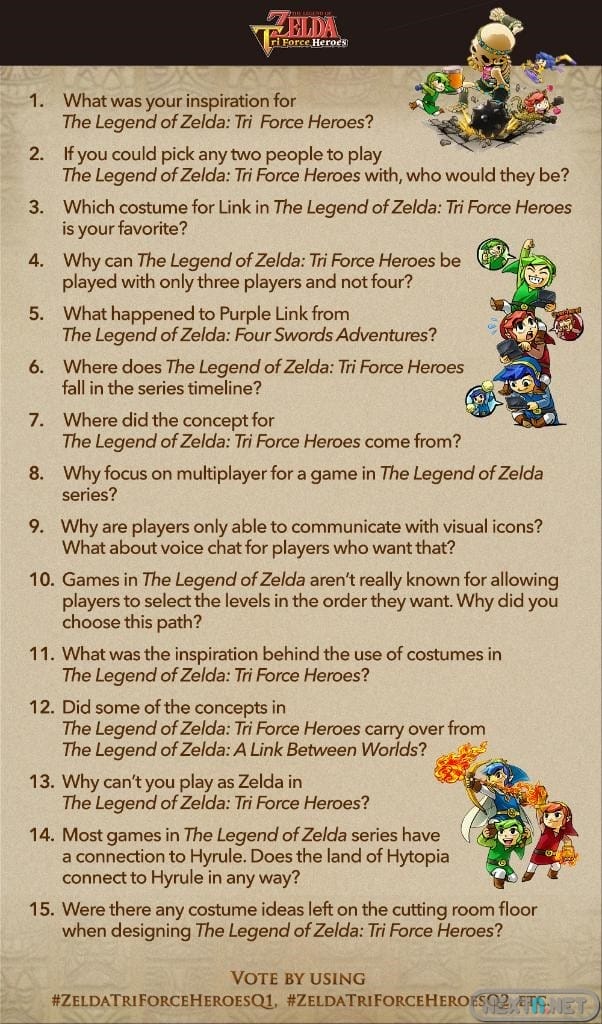 Precisamente, la cuenta de Twitter americana ha lanzado una curiosa propuesta: una votación mediante la red social para escoger 5 preguntas sobre el juego entre una lista de 15, y que responderán los propios desarrolladores. Para votar, solo hay que lanzar un tuit con el hastag #ZeldaTriForceHeoriesQ1 si quieres que respondan a la pregunta 1, #ZeldaTriForceHeroesQ2 si quieres saber la respuesta a la pregunta 2, y así sucesivamente. Nintendo cogerá los hastags que más tuits hayan generado y hará que sus desarrolladores respondan a esas preguntas, aunque el cómo y el cuándo es aún un misterio. Por si acaso, estad atentos a su cuenta de Twitter y la página web del juego.