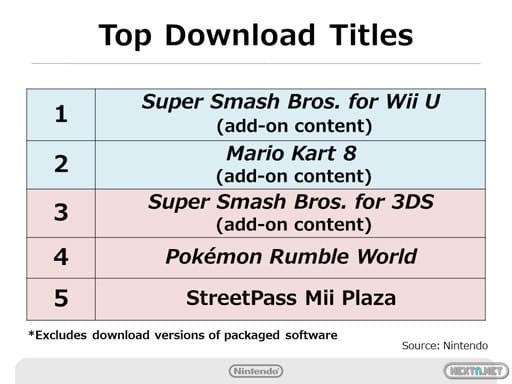 Por otro lado, el listado sobre estas líneas muestra los videojuegos que más movimiento han tenido en la eShop de Nintendo. Curioso que aquí veamos figurar los criticados juegos de la Plaza Mii, mientras que los que encabezan la lista no se trata de esos juegos en sí, sino de los DLC de pago de Super Smash Bros. y Mario Kart 8.