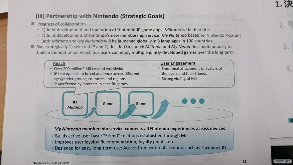 Otro dato que podemos extraer de los documentos de la presentación es que, según parece, el sistema de membresía My Nintendo estará fuertemente ligado a los personajes Mii. Según se indica en esta docmentación, «My Nintendo es un servicio de membresía que conecta a todos las experiencias Nintendo a lo largo de dispositivos» que permitirá «construir una base activa de usuarios» en base a un sistema de «relaciones de ‘Amigo’ establecidas a través de los Mii». Se comentan otros datos conocidos, la finalidad de aumentar la «lealtad de los usuarios» gracias a «recomendaciones, puntos de lealtad, etc.», así como la facilidad de uso de todo el sistema, basado en el acceso desde cuentas externas como nuestro ID de Facebook.