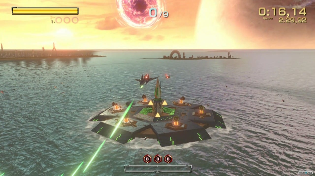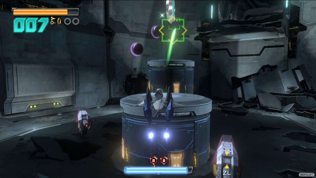 En la pantalla del Wii U GamePad disponemos de una vista de cabina, en primera persona, como si fueras el propio piloto. Si no pulsas ningún botón, es muy útil incluso si no miramos a esta pantalla, para apuntar levemente haciendo uso de los controles giroscópicos por movimiento, de forma similar a como lo hemos hecho, y tanto éxito ha tenido, en Splatoon. Lo dicho; es que no tienes ni que mirar a la pantalla… a no ser que desees más precisión, pues vas a tener una mejor visión de la situación. Y todo eso sin pulsar un botón, pues la cosa se complica cuando nos exigen pulsar ZL; al presionar este botón, el control completo de la nave pasa a ser giroscópico, es decir, irá en la dirección que muevas el Wii U GamePad, y tendrás que apuntar con precisión. En estas situaciones al principio puede que te veas bastante incómodo con el control, no llegarás a comprender cómo es que han tomado tal decisión, cuando el control inicial es tan bueno. Pues no es por otra cosa que por darle uso a esa segunda pantalla, que de otra forma habría mostrado un radar (cosa que no encontrarás en el juego), un mapa, o alguna similar pantalla de ayuda complementaria, como han hecho otros títulos del sistema. Por supuesto, tras unas partidas, cuando ya te hagas hecho con este control, la dificultad en ese sentido desaparece casi por completo. No lo voy negar, no es mi parte favorita del control, pero también es cierto que es una barrera inicial que debe superarse jugando.