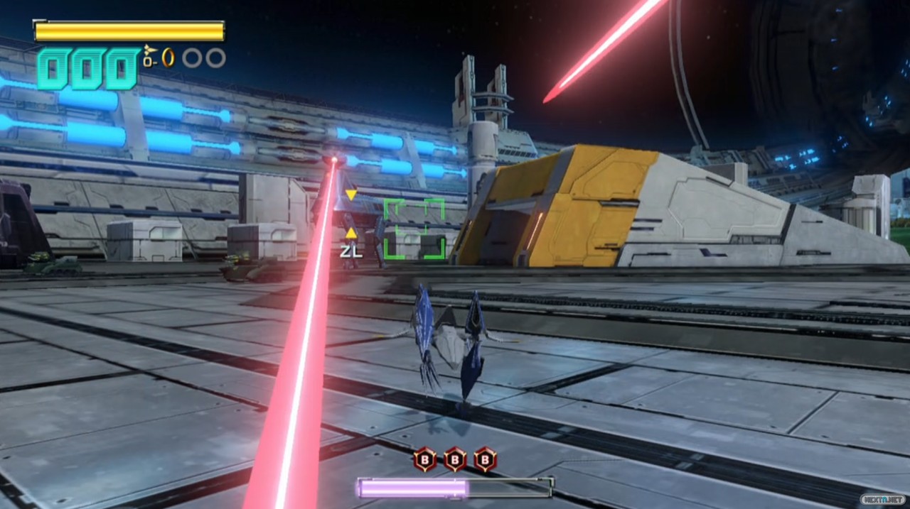 Entonces, llega el momento de pilotar el Gyrowing en la fase de infiltración de Zoness, y su combinación entre el típico control de un dron, con menos maniobrabilidad pero buena potencia de disparo, y la combinación con el simpático robot Direct-i, que es la auténtica salsa de este vehículo aéreo, y otra forma diferente de hacer uso del Wii U GamePad. Con el botón A, descolgaremos con un cable al autómata en el lugar que queramos (como si queremos dejarlo colgando), y una vez toque el suelo, utilizaremos la pantalla del Wii U GamePad para desplazarlo a los lugares que haya que hackear, o bien para coger unas monedas plateadas repartidas por el nivel. El control de esta nave, de nuevo, otro punto a favor, algo con lo que disfrutarás en Star Fox Zero.