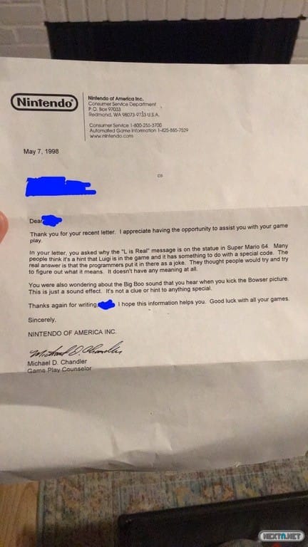 Resulta que la curiosidad por descifrar este mensaje llevó al usuario de Reddit b0nd18t a preguntar directamente por él a Nintendo América, recibiendo una carta que data de 1998 con la respuesta a una pregunta que ha llevado de cabeza a miles de usuarios durante décadas: