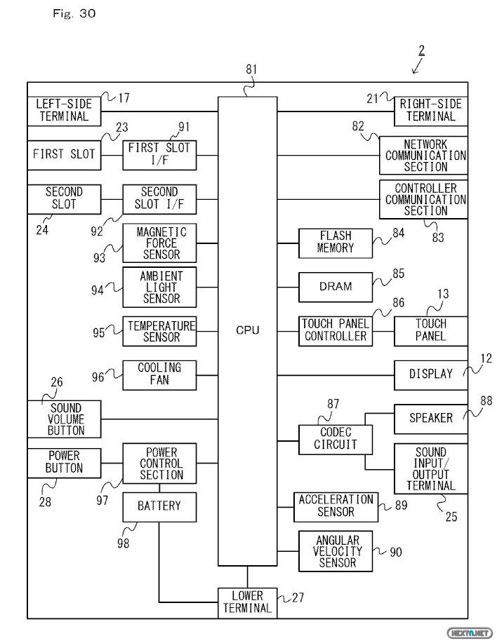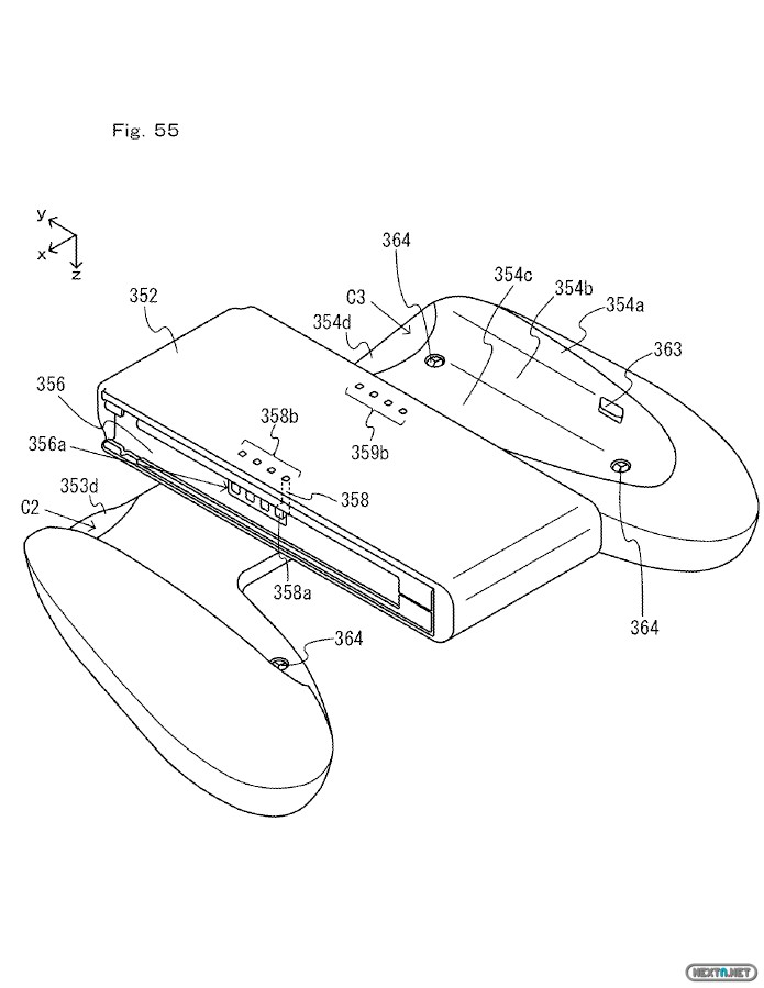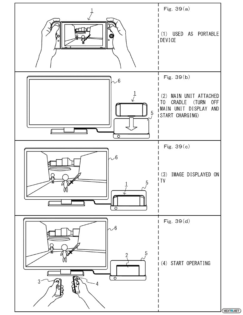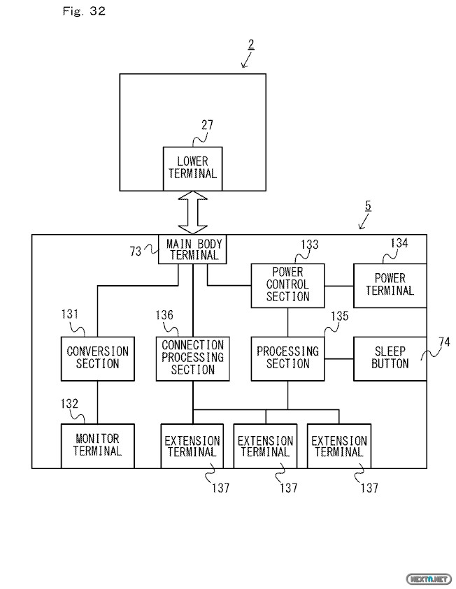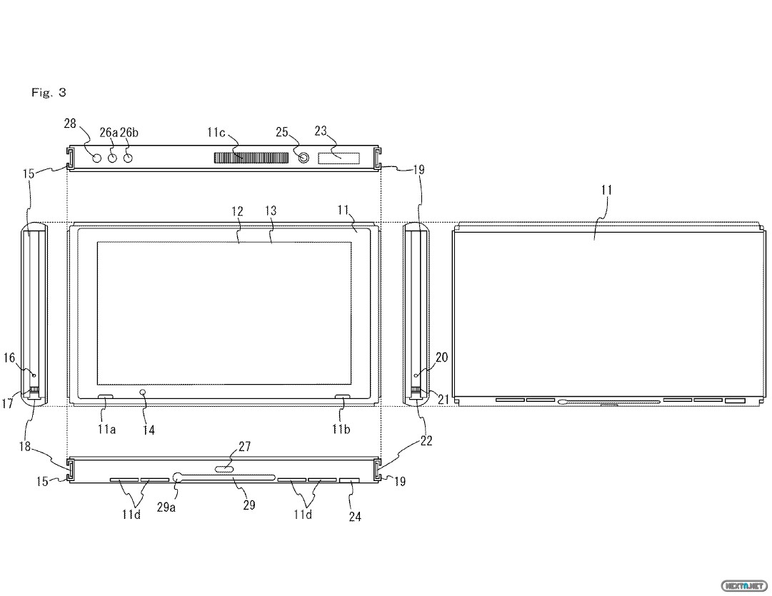 - Las «terminales» amplían la funcionalidad de la unidad central: Los bloques «terminal» son los fieles compañeros de batalla que acuden al auxilio de la unidad de Switch en cuanto se conectan. Están las terminales izquierda y derecha, que corresponden con los mandos que se puedan acoplar a la consola (se comentará posteriormente), la terminal de entrada/salida de sonido y la terminal inferior, que es donde la consola se conectará a la base y tiene una apariencia muy similar a la de un USB tipo C. Entre las capacidades de ésta se menciona que al estar conectada, además de la carga de batería y conexión con otros posibles dispositivos USB, la salida a televisión podría tener mejor calidad gráfica porque la propia patente distingue entre modo consola y modo portátil.
