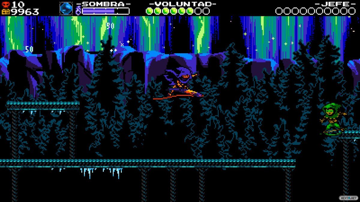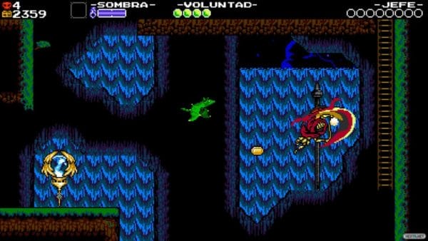 Esta vez no hay palas, ni tampoco bombas. Nuestra arma principal es una guadaña y nuestros movimientos son muy distintos a los de Plague Knight o el propio Shovel Knight. Specter Knight puede trepar ligeramente por las paredes para llegar a esas cornisas a priori inaccesibles, pero su movimiento estrella viene ligado a su forma de atacar. Nuestro personaje se abalanza diagonalmente sobre los enemigos cuando ataca en el aire, sirviéndoles incluso de impulso para desplazarse por los escenarios. Esto, además, viene influido por la posición en la que se encuentren: si Specter está por encima de su presa, se lanzará en diagonal hacia abajo; si está por debajo, se tirará hacia arriba.