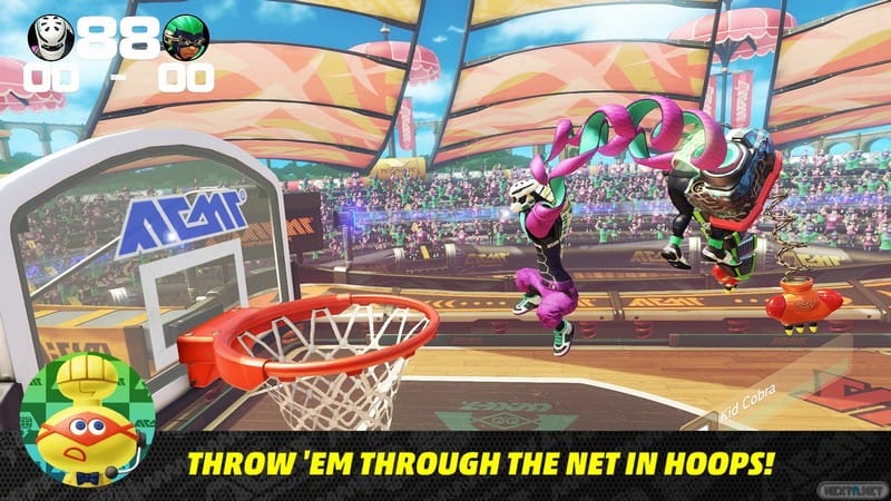 Además del Gran Premio, y los combates multijugador, ARMS contará con un buen puñado de modos adicionales para evitar caer en la monotonía. Por un lado, tenemos el Baloncesto, en el que lucharemos por encestar… al rival. Para hacerlo, basta con realizar un agarre (mover ambos Joy-Con hacia delante), y automáticamente lanzaremos al rival a la (única) portería. Si estamos dentro del área, lo haremos con un espectacular mate, y contará dos puntos… pero si es fuera del área, marcaremos un triple.