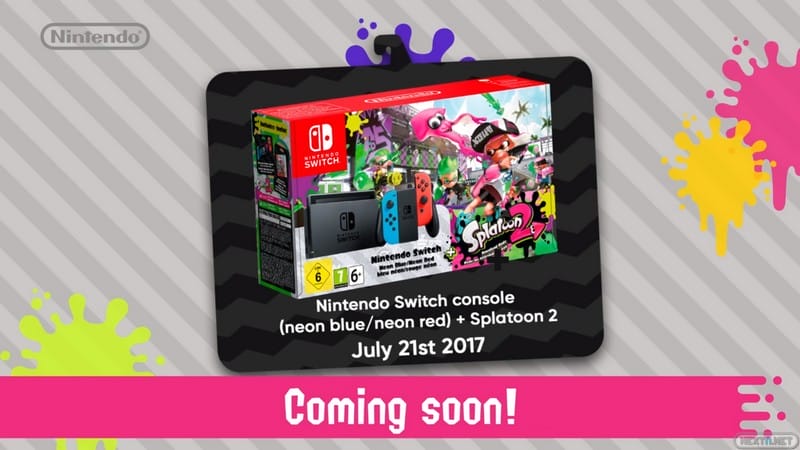 De momento, parece que los siguientes productos son solo para el mercado europeo. Se trata de un pack con la consola Nintendo Switch de colores celeste y rojo más el juego Splatoon 2 (con código de descarga). Esta estará a la venta el día 21 de julio, el mismo día que el juego, y que estos dos accesorios: un Mando Pro de color verde y rosa neón, y una funda protectora para Nintendo Switch de los mismos colores y motivos del juego. Más adelante, en otoño, se venderá un pack con Joy-Con de esos mismos colores (aunque sin temática de Splatoon, al parecer), pero que básicamente confirma (junto con los Joy-Con amarillos de ARMS) que Nintendo Switch va a ser la consola más colorida de la historia.