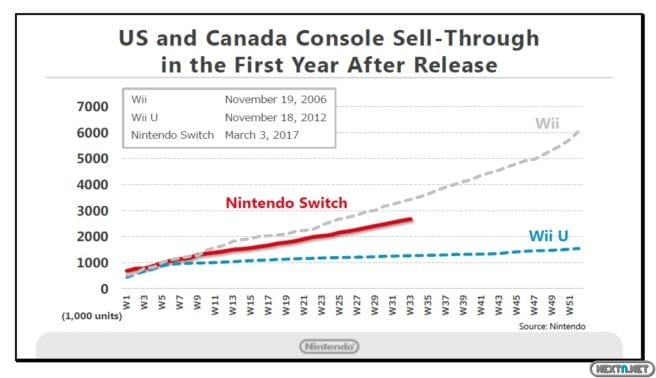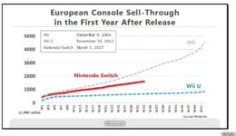 Otro de los puntos de los que se ha hablado en esta exposición, han sido las ventas de Nintendo Switch. Desde su salida, la consola híbrida de Nintendo lleva la friolera de 7,63 millones de unidades vendidas en todo el mundo. Parece ser que la Gran N está sabiendo afrontar los errores del pasado para no volver a cometerlos. En este caso, lo que se han presentado son unos gráficos comparando la salida de Nintendo Switch con las ventas de salida de Wii y Wii U en Norteamérica, Japón y Europa. Como se puede comprobar, a las pocas semanas las ventas de Wii superan a las de Nintendo Switch, pero ¿por qué? Por una razón muy sencilla, y es que tanto Wii como Wii U, sus fechas de lanzamiento fueron enfocadas a la campaña navideña, siendo una gran estrategia. Por el contrario, Nintendo Switch fue lanzada en marzo, siendo una fecha totalmente diferente y algo más complicada a nivel de ventas. Por ello, aunque en los gráficos se vea que Wii despunta más, no hay que menospreciar el nivel de ventas que está teniendo la consola de los Joy-Con.