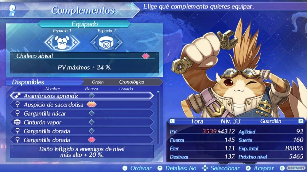 Por otro lado, tenemos alforjas para cada personaje donde equipar objetos que mejorarán ciertas estadísticas de forma temporal separados en diversas categorías; alimentos básicos, bebidas, postres, juegos de mesa, literatura… la gracia del asunto está en que cada elemento podría ser el favorito de un piloto o Blade, tendrás que ir probando para encontrar cuáles son, y desbloquear con ello nuevas características o poderes en su árbol de habilidades o afinigrama, uno de los elementos más importantes del juego que podrían limitar tu avance al no haber desbloqueado las competencias necesarias para poder continuar.
