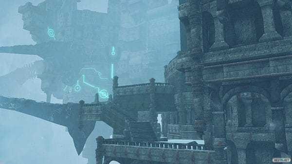 Por lo general, Alrest es precioso... pero, en cuanto a mundo, en algunos sentidos está algún que otro paso atrás con respecto a Mira de Xenoblade Chronicles X, que se presentaba como un inmenso planeta con varios continentes que explorar en los que podía perderse la vista, con enormes criaturas que tenían varios puntos de impacto a la hora de enfrentarlas, incluso algunas partes de su cuerpo podían ser debilitadas o destruidas independientemente. Habría gustado contar con algún tipo de medio de transporte para desplazarnos libremente por el mundo de Xenoblade Chronicles 2, viajar por su mar de nubes divisando a lo lejos el titán que quieres visitar, como si un The Legend of Zelda: The Wind Waker se tratara o incluso el anterior título de esta serie. Sin embargo, los mechas llamados Skells hicieron mucho daño en cuanto a la exploración del anterior capítulo, y la posibilidad de volar libremente o viajar a donde quieras chocan directamente con tener un argumento lineal. En pocas palabras, Alrest lo explorarás «a pata», y no es malo en el sentido de que vuelve la exploración y el tener que fijarte por donde vas si quieres encontrar el camino, por lo que se agradece. Los personajes, además, son más «torpecillos»; te darás cuenta de que hay sitios por los que no vas a poder ir y límites de escenario que están para que no puedas trepar o avanzar con libertad, o daño / muerte para el personaje si saltas desde demasiado alto, todo esto contrastando contrastando directamente con Xenoblade Chronicles X.