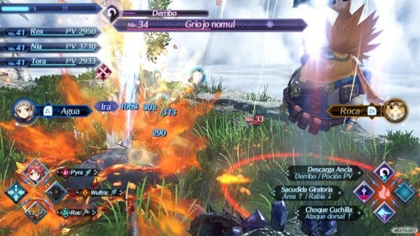 Durante el transcurso de la aventura no hemos encontrado grandes dificultades, más allá de tener que subir de nivel en alguna ocasión para acabar con un jefe que se resistía. Las mecánicas para derrotar a un enemigo no son muy complejas, el sistema de combate ha sido simplificado haciéndolo más accesible, más rápido de ejecutar, con mecánicas que tendrás que aprender para sacarle el máximo resultado al sistema de combate por turnos que ya conocíamos. Básicamente consiste en aprender qué personajes tienen ataques con un determinado efecto y aplicarlos en el orden de «Desprotección», «Derribo», «Lanzamiento» y «Tunda». Tenemos gran cantidad de elementos potenciadores que pueden aumentar la capacidad de cada uno de estos efectos, pues hay enemigos que son resistentes a ellos. Estos se asignan a pilotos y Blades, en unos espacios limitados que te harán debatirte sobre qué característica es la que más te conviene mejorar. Ciertamente, no es algo con lo que obsesionarse, con un buen nivel casi todo obstáculo es salvable, siendo lo importante siempre tener bien equipados a los Blade con chips que mejoren sus armas (aquí si cambia la apariencia de éstas, menos en el caso del arma de la Égida).