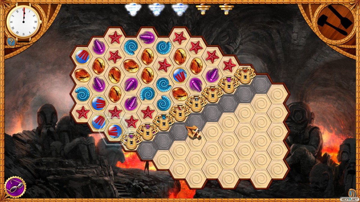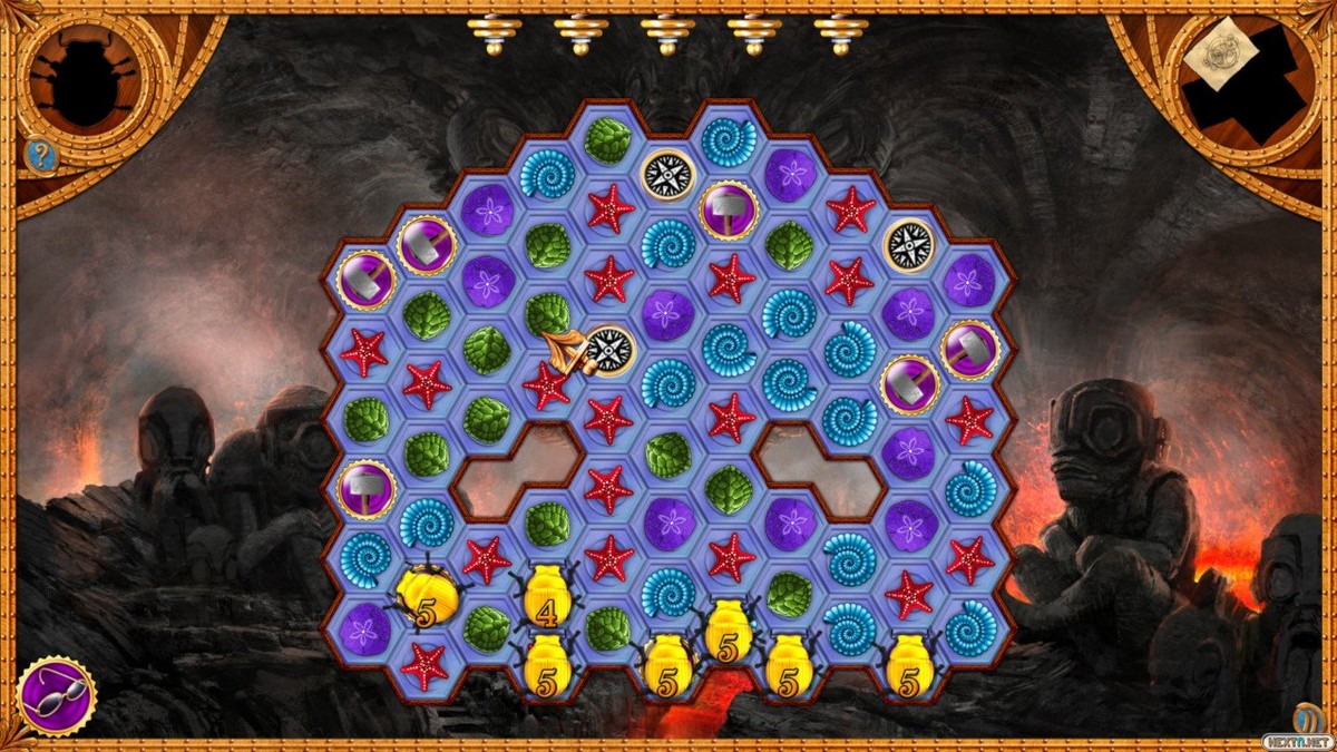 Así es como a modo de tutorial se nos presenta nuestra primera misión y sistema de juego de Azkend 2, una aventura que contiene la cifra de 60 puzles dotados con una diversidad de mecánicas variadas. Para completar los puzles sólo tenemos que realizar enlaces de 3 o más objetos, obteniendo cargas eléctricas en los enlaces de +5 ítems que serán de gran utilidad en cualquier modo de juego. Una vez cumplamos el objetivo de un nivel, aparecerá en la parte superior del panel un objeto (o una de las partes que lo forman, más bien) que tendremos que extraer del tablero posicionándolo en una de las casillas situadas en la parte inferior. Por supuesto, estaremos en todo momento bajo la presión de un cronómetro que nos otorga un tiempo limitado para completar la misión y conseguir el objeto clave.