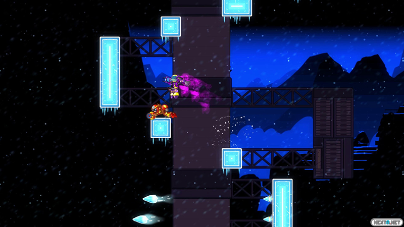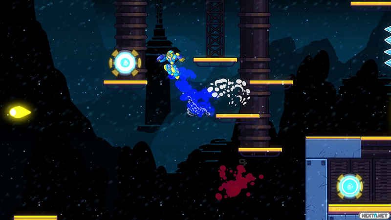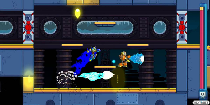 La estructura de este título es, por tanto, totalmente fiel a la de los Mega Man más clásicos, incluso con sus 8 jefes principales a los que podemos enfrentarnos prácticamente en el orden que queramos, en este caso como una ruleta de tres opciones entre las que debemos escoger una y así sucesivamente, más otros dos extras a modo de broche final. El detalle especial está en que tenemos que lograrlo todo del tirón, porque si caemos en combate tenemos que volver a empezar de cero, eso sí, con el dinero acumulado para conseguir más mejoras de entrada (de velocidad, resistencia a los impactos, tamaño de la barra de vida, fuerza de los disparos…) y con el nivel completamente cambiado respecto al anterior intento, lo que viene siendo un Roguelite procedural en toda regla, vaya. Ese es el modo principal de juego con el que contamos, con tres niveles de dificultad entre los que elegir, que difieren tanto en el número de intentos que disponemos antes del Game Over como en las complicaciones que nos van a causar los enemigos a derrotar; la gracia principal está en que podemos abordar esta aventura tanto en solitario como en compañía de otro jugador de manera cooperativa, ya sea en local o en online, que es lo que realmente le da más vidilla al asunto.