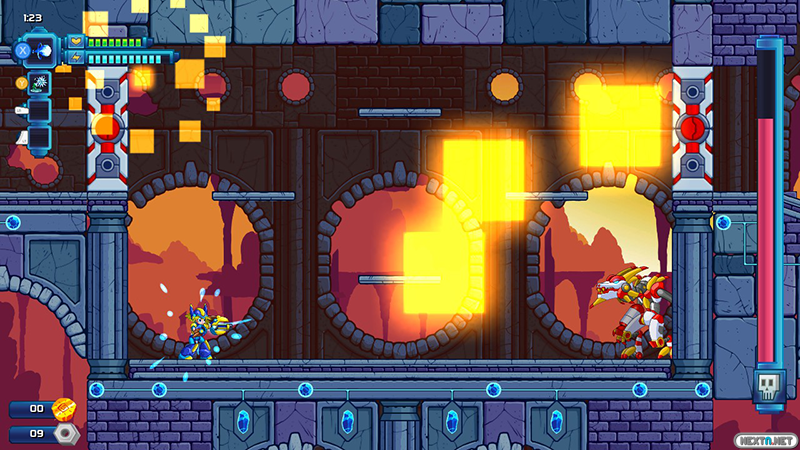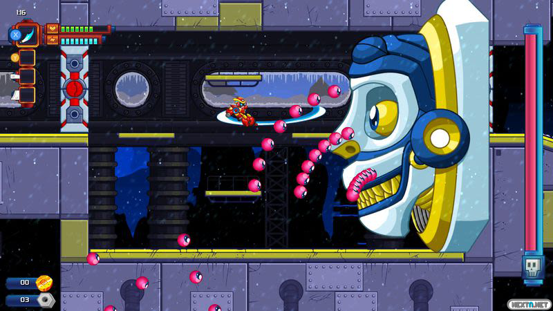 En conclusión, estamos ante un título que es más que un digno heredero espiritual de todo lo que representa a la saga Mega Man, en especial a la subserie X, que es a la que más se parece (y que se ubicaba 100 años más tarde de los eventos de la saga principal, de ahí la pregunta ociosa que me viene a la cabeza), de por sí, y como suele ocurrir en los roguelike de generación procedural, la duración es bastante relativa, puesto que depende de la habilidad de cada jugador. Completar la aventura principal (derrotar jefe tras jefe hasta el final) en solitario puede llevar pocas horas (de una a tres horas más o menos, según las veces que haya que volver a empezar) pero claro, como cada vez que volvemos a intentarlo se presentan niveles con estructura diferente (con algún que otro pequeño dejá vu, todo hay que decirlo) y se comienza desde el jefe que nos derrotó para continuar después con el resto en diferente orden, da una sensación artificial pero creíble de no tener fin hasta que no se logra completar el ciclo completo. Aparte hay que sumarle el gran acierto del cooperativo local y online, que da mucho de sí al tratarse de un juego de acción tan sencillo como adictivo gracias a su estupenda jugabilidad, y los desafíos diarios con ranking online , por lo que en conjunto dicha duración se puede hasta duplicar, además de convertirse en una opción multijugador estupenda para cualquier momento.