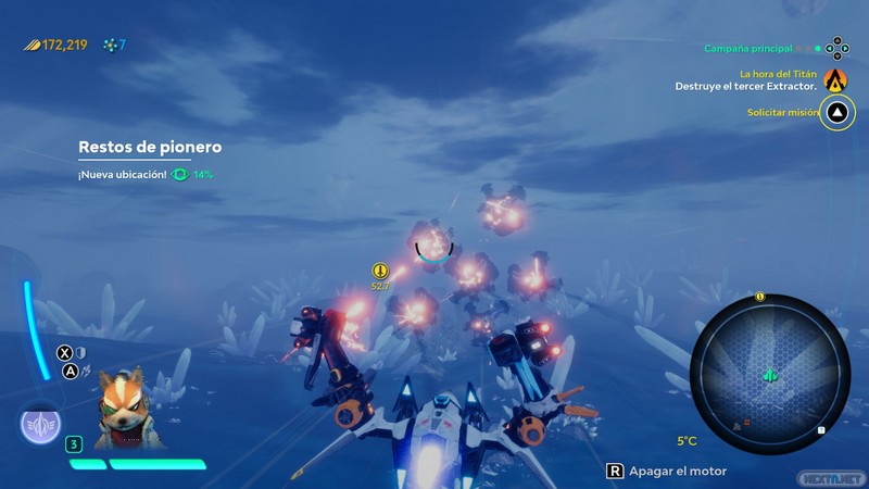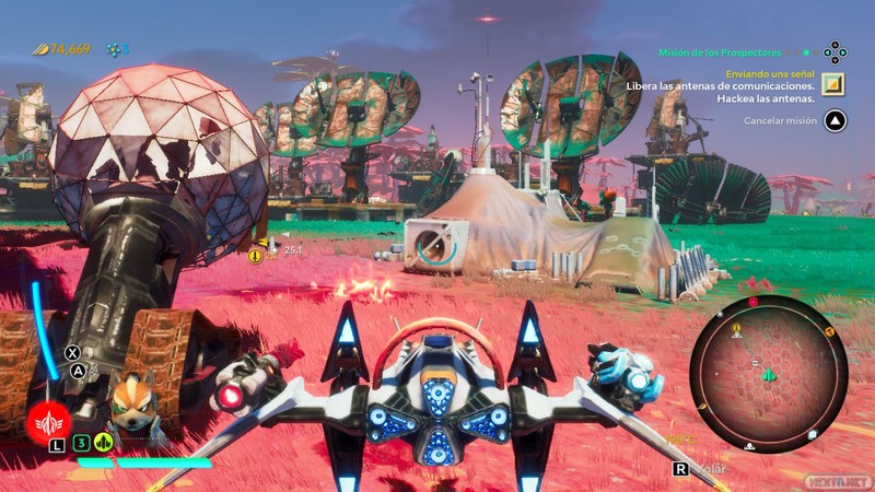 Estos toques roleros favorecen enormemente un juego mucho más profundo y estratégico de lo que en apariencia podría parecer. Aunque pasemos la mayor parte del tiempo combatiendo, tanto con naves y acorazados espaciales como con monstruos y fortalezas terrestres, el juego no se limita a una sucesión de escenas de acción, sino que teje un mundo abierto muy dinámico lleno de cosas por hacer y sitios que descubrir. El juego nos va enseñando a través de su historia principal, salpicada de escenas cinemáticas dobladas al castellano, todo lo que podemos hacer en Atlas, antes de soltarnos a explorar, combatir y farmear a nuestro gusto. Resulta que la Legión, los malos, están invadiendo cada uno de los planetas, y nuestra misión, además de liarnos a tiros, es organizar la resistencia para prepararnos para la batalla final. Tenemos que construir bases (como refinerías que obtienen recursos o talleres para mejorar nuestras naves), mejorarlas (en muchos casos a través de misiones «no conflictivas» como búsqueda de recursos o escaneo de fauna) y destruir la presencia enemiga en sus diferentes formas invasoras. También hay misiones secundarias que exploran más en la personalidad de los personajes y, en la versión de Nintendo Switch, unas misiones adicionales protagonizadas por el equipo Star Fox tras la pista de Wolf.