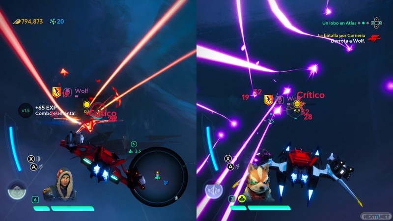 Todo lo que hagamos con nuestros juguetes en la vida real se refleja en el juego. Si tienes dos naves «físicas» puedes retirarles las alas a una y colocárselas a la otra para tener una bestia parda perfecta para el combate… o jugar solo con el fuselaje, el «morro» de la nave: no tendrás armas, pero irás a toda mecha. También puedes conseguir algo intermedio si en el lugar de las alas pones las armas. Puedes incluso colocar un arma del revés, podrás disparar a los enemigos que tengas en la cola. Y ojo, que no son cambios solo estéticos: afectan a las estadísticas de la nave, su energía, defensa, velocidad, peso, ataque. Cada pieza (fuselaje y armas) cuenta además con múltiples ranuras para colocar potenciadores (que se obtienen a lo largo del juego, de estos no hay juguetes) con distintos efectos, desde daños elementales, obtener más experiencia, mayor velocidad o mayor cadencia de disparo en las armas. Y ojo, que el piloto (la figurita que se coloca debajo del fuselaje) cuenta también con su propio árbol de habilidades, además de un movimiento especial único. En el caso de Fox, invoca a Falco, Slippy o Peppy al combate durante un breve tiempo muy épico en el que suena cañero el tema musical de la saga, pero los hay de muchos tipos: desde atacar con ráfagas en un microjuego de ritmo a camuflarse brevemente (este último increíblemente útil).