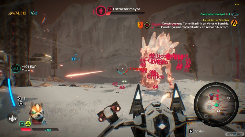 Starlink está protagonizado por un variado y muy amplio reparto de personajes que forman parte de una expedición científica en el sistema planetario Atlas, pero que pronto se ve envuelto en una guerra por el control de los recursos que movilizará a los habitantes de todos estos planetas. Podemos jugar la aventura con cualquier piloto y nave que tengamos (en el Starter Pack para Nintendo Switch vienen incluidos dos: Mason Rana, el creador de la tecnología Starlink, y nuestro amigo Fox McCloud, invitado exclusivo para nuestra versión, además de la nave Arwing y la nave Zenith en formato digital). Esa tecnología Starlink es la excusa en el juego para lo que hacemos en el mundo real: modificar en cualquier momento nuestra nave para acoplar nuevas armas, cambiar entre pilotos o incluso colocar un par de alas adicionales para así obtener mayor potencia (a sacrificio del peso y velocidad, claro).