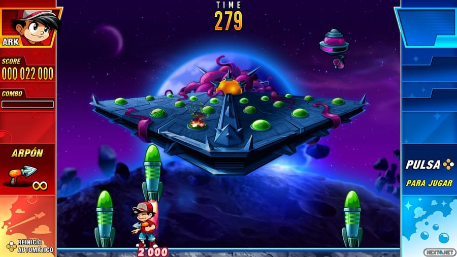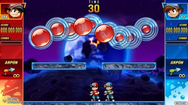 La jugabilidad es completamente igual que toda la saga, vamos a estar jugando en un entorno cerrado donde rebotan unas bolas por todo el escenario. Para poder acabar con ellas tenemos nuestra pistola de ganchos, aunque durante toda la aventura vamos a poder encontrar diferentes armas que hacen más sencillo eliminar las endiabladas bolas. Hablo de endiabladas porque en alguna ocasión vamos a estar en más de un apuro si no calculamos bien el rebote de estas bolas o incluso si nos vemos asediados por gran cantidad de ellas. Esto es debido a que cuando golpeamos una bola grande esta se divide en otras más pequeñas, hasta llegar a unas bolas diminutas. Si no tenemos cuidado y atacamos esas bolas grandes sin cabeza, podemos vernos en una pantalla con numerosas bolas pequeñas que pueden golpearnos desde cualquier lado. Pero si esto os parece complicado, hay que hablar del tiempo, ya que en el modo Tour vamos a estar restringidos por un tiempo concreto y si no logramos acabar con todas las bolas antes de que finalice el tiempo, perdemos y hay que volver a empezar esa pantalla.