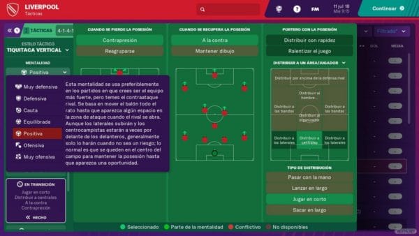 Para facilitar todo esto, la versión de este año ha añadido una serie de opciones predeterminadas para orientarnos a la hora de diseñar nuestra táctica. De esta manera, podemos escoger la opción «Tiqui-taca» si queremos optar por un juego de posesión o bien «Catenaccio» si buscamos un equipo que se centre en la solidez defensiva, para mencionar algunas de las opciones. Estos estilos tácticos, como los denomina el juego, nos autoseleccionan las instrucciones generales del equipo y nos sugieren las formaciones que mejor se adaptan a este estilo, aunque luego podemos cambiar lo que queramos. Otra novedad de este año es que ahora las instrucciones al equipo se han dividido en tres aspectos del juego: con posesión, en transición o sin posesión, que nos permite adaptar las instrucciones a los jugadores en situaciones más específicas.