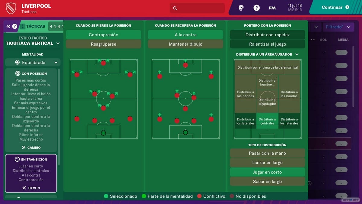 Para facilitar todo esto, la versión de este año ha añadido una serie de opciones predeterminadas para orientarnos a la hora de diseñar nuestra táctica. De esta manera, podemos escoger la opción «Tiqui-taca» si queremos optar por un juego de posesión o bien «Catenaccio» si buscamos un equipo que se centre en la solidez defensiva, para mencionar algunas de las opciones. Estos estilos tácticos, como los denomina el juego, nos autoseleccionan las instrucciones generales del equipo y nos sugieren las formaciones que mejor se adaptan a este estilo, aunque luego podemos cambiar lo que queramos. Otra novedad de este año es que ahora las instrucciones al equipo se han dividido en tres aspectos del juego: con posesión, en transición o sin posesión, que nos permite adaptar las instrucciones a los jugadores en situaciones más específicas.