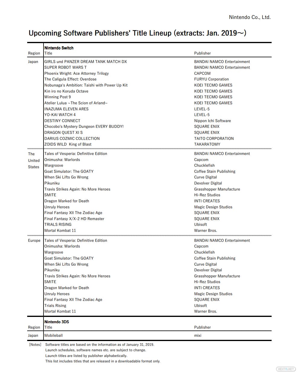 Recuerda que estos listados no son definitivos, que la propia Nintendo, así como empresas third party, tienen mucho que revelar este 2019. ¡Tiempo al tiempo!