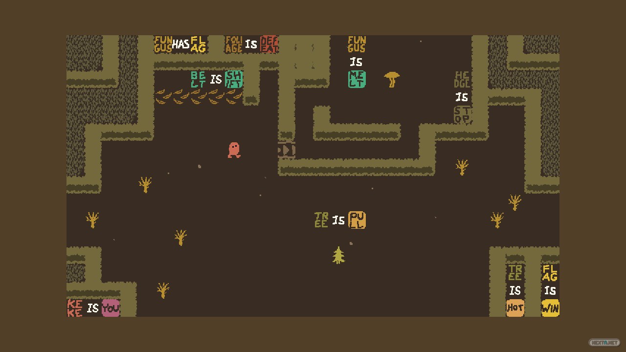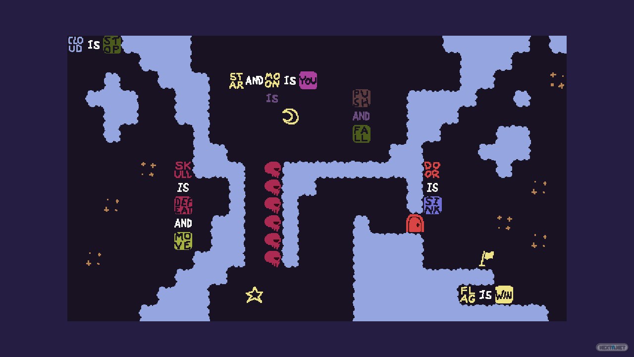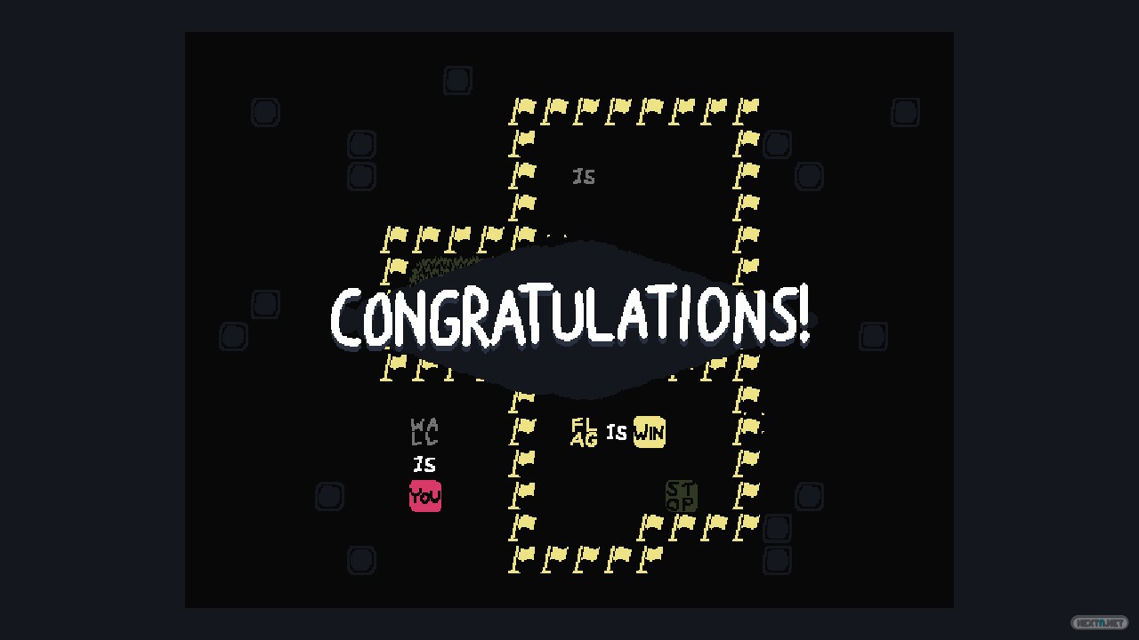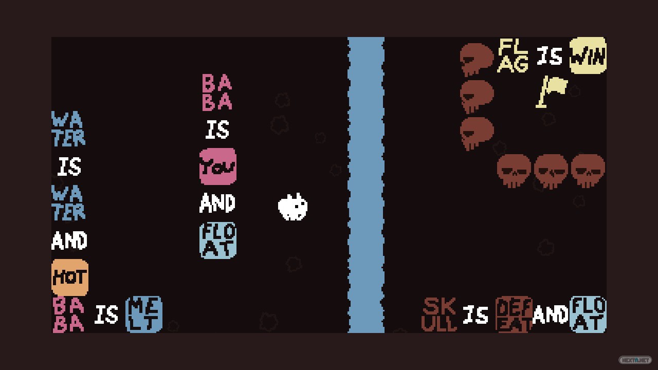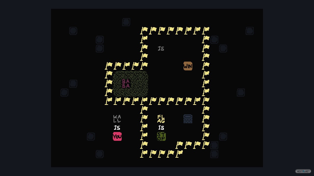 El objetivo de cada nivel es llegar al objeto cuya propiedad es ‘win’ (ganar en inglés), que suele ser una bandera. Sin embargo, encasillarte en esta idea puede hacer que te bloquees y no sepas cómo continuar. Estamos diciendo que las reglas se pueden cambiar, ¿no? Quizá debas mover el bloque que corresponde a la victoria y juntarlo con un objeto diferente para poder superar el nivel. Puede parecer algo obtuso, pero en un par de niveles se entiende el concepto a la perfección.