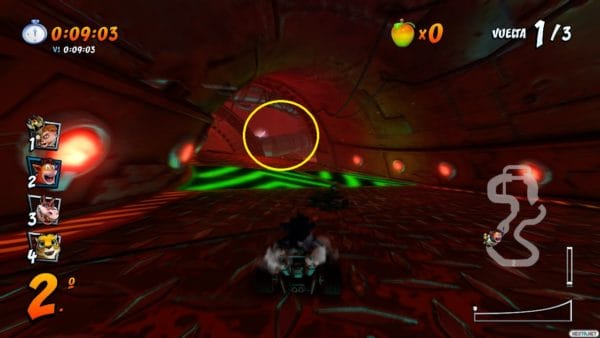 - Letra R: Esta letra es algo compleja de conseguir, ya que se encuentra en la caída que hay tras el propulsor verde de la tercera foto. Para conseguirla, tenemos que situarnos, más o menos, en el centro de la pista. Podría decirse que es de las letras más difíciles de conseguir de Crash Team Racing: Nitro-Fueled.