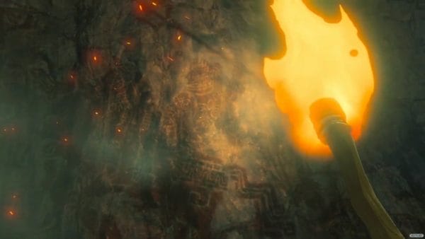 Los primeros segundos del tráiler son desconcertantes. Para empezar, nos encontramos con una gran espiral que emana diferentes caracteres del alfabeto Gerudo, que pudimos conocer en entregas como Ocarina of Time, Twilight Princess y Breath of the Wild. Esta conexión es bastante clara, pero la cosa va más allá cuando la luz que proviene de la antorcha de nuestros protagonistas nos enfoca diferentes pinturas en las paredes de lo que parece ser una especie de mazmorra subterránea o una catacumba. Estos dibujos nos muestran a lo que parece ser a Ganondorf a caballo, con su característico tridente visto en alguna que otra ocasión y detrás de él, aparecen otros dos personajes. Esto puede ser una referencia al final de Twilight Princess, donde Link y Zelda le hacen frente en la campiña de Hyrule montados sobre Epona.