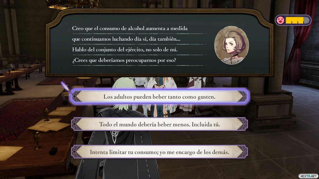 Prácticamente nada más empezar el juego podemos conocer a los líderes de cada casa y un poco más adelante a los estudiantes que conforman cada clase. Todo con el fin de prepararnos ante la gran decisión y es que, aunque durante gran parte del juego nuestra vida en la academia trascurre de forma normal (sin apenas diferenciarse la historia independientemente de la casa escogida), a partir de cierto punto del juego todo cambia y es ahí cuando realmente vemos la magnitud de la decisión (o decisiones) que hemos tomado. El juego está lleno de decisiones, algunas más relevantes que otras, aunque muchas de ellas sirven para reforzar los vínculos con otros personajes. Estos vínculos determinan qué personajes pueden unirse a nuestra causa y nos abren rutas alternativas (misiones secundarias) donde podemos conocer mejor el trasfondo y motivación de nuestros aliados, sirviendo de complemento la propia historia. Durante el trascurso de la historia podemos encontrar varios giros y elementos ya típicos de la saga: amor y desamor, traiciones, desengaños, monstruos, magia, leyendas… Aunque debemos mencionar que en esta ocasión, la historia es mucho más profunda y está mejor hilada que en entregas anteriores, lo que hace que este elemento se convierta en uno de los puntos fuertes de este título. En cierto modo, las decisiones y su implementación en la historia van un paso más allá a lo visto en Fire Emblem Fates, dando la sensación de que realmente podemos influir en el desarrollo de los hechos.