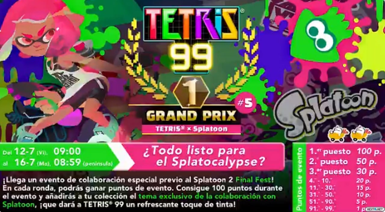 Tetris 99, el battle royale que nadie pidió pero que ahora todo el mundo juega a todas horas, es uno de los juegos más populares de Nintendo. Si sois de aquellos a los que les gusta competir en extremo, entonces estáis de suerte, ya que el próximo 12 de julio a las 9 de la mañana dará comienzo el Gran Prix 5 y estará disponible hasta las 8:59 de la mañana del 16 de julio. La peculiaridad de este torneo respecto a los anteriores es que se trata de una colaboración con Splatoon 2, por lo que, si conseguimos 100 puntos, se nos dará un tema para el juego, el cual podéis ver en el trailer de arriba. ¡Nos mancharemos enteros de tinta hasta con los bloques!