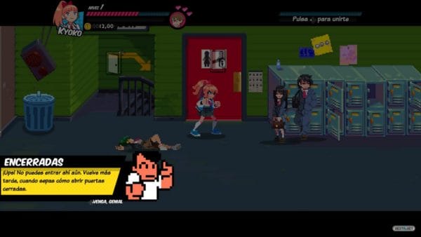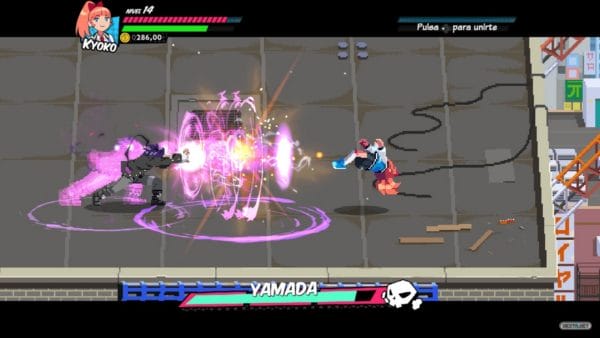 La propuesta que nos trae Wayforward y Arc System Works nos cuenta la historia de Kyoko y Misako en su odisea por rescatar a los que, hasta ahora, eran los protagonistas de la saga, Kunio y Riki. La historia puede que no destaque por un guión demasiado elaborado, aunque hemos de reconocer que el toque de humor surrealista le sienta a las mil maravillas, pero lo que sí sabe hacer con maestría es cambiar los roles pre-establecidos al presentar a dos chicas como valientes heroínas dispuestas a todo por rescatar a sus respectivos novios. Dos chicas rebeldes que en mitad de una soporífera clase de secundaria reciben un mensaje en el que se muestra cómo sus chicos son raptados. Como os podéis imaginar es en este punto donde da comienzo esta alocada, a la par que divertida, aventura.