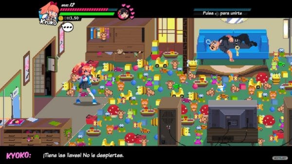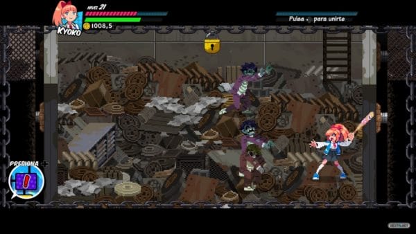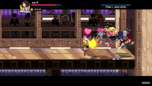 En lo relativo a su durabilidad… puede que una buena parte del tiempo estemos disfrutando de alguna intro o de sus hilarantes líneas de texto. No obstante, el hecho de contar con modo multijugador local para 2 jugadores (2 Joy-Con), la posibilidad de activar el fuego amigo, sus diferentes niveles de dificultad, misiones secundarias y los nuevos y sugerentes añadidos tras completar el juego, hacen que la aventura se extienda unas cuantas horas más de lo habitual en este género. Por si fuera poco, sus 6 niveles, conectados entre sí, hacen que no nos encontremos ante una aventura lineal, llevándonos a recorrer localizaciones tan variadas como un instituto, un vertedero o unos recreativos. Las diferentes misiones secundarias, anteriormente comentadas, los objetos que recopilar (previo pago) e incluso sus distintos secretos complementan un apartado casi redondo. Por desgracia, el hecho de tener que regresar sobre nuestros pasos bastante a menudo hace que, dada la estructura y dimensiones de los escenarios, pueda resultar en algunos momentos algo repetitivo. En contraposición, contar con la posibilidad de jugar junto a un compañero con Kyoko y Misako mano a mano es toda una deliciosa locura. Eso sí, conviene recalcar que, a diferencia de otras obras diseñadas para jugar en compañía, no nos encontramos ante un título aburrido en su modo para un jugador, siendo perfectamente disfrutable en solitario.