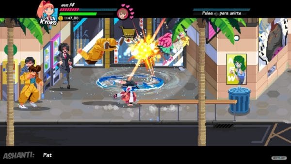 Abordado su aspecto jugable toca adentrarnos en terreno gráfico. Artísticamente hablando poco se puede reprochar a River City Girls. Desde el minuto uno de juego se nos presenta un delicioso pixel-art cuidado hasta el más mínimo detalle. El puesto de comida, la estación de metro, la llave inglesa o la iluminación del centro comercial. Cualquiera de los elementos que aparecen en pantalla son recreados de una forma que, aunque respetuosa con los primeros títulos de la saga, aporta grandes dosis de belleza a una propuesta ya de por sí espectacular. Por si no fuera suficiente, durante la aventura abundan intros de estilo anime, que se entremezclan con los momentos viñeta y con las diversas y elaboradas ilustraciones que incluyen no solo a nuestras protagonistas, sino también a una gran variedad de personajes.