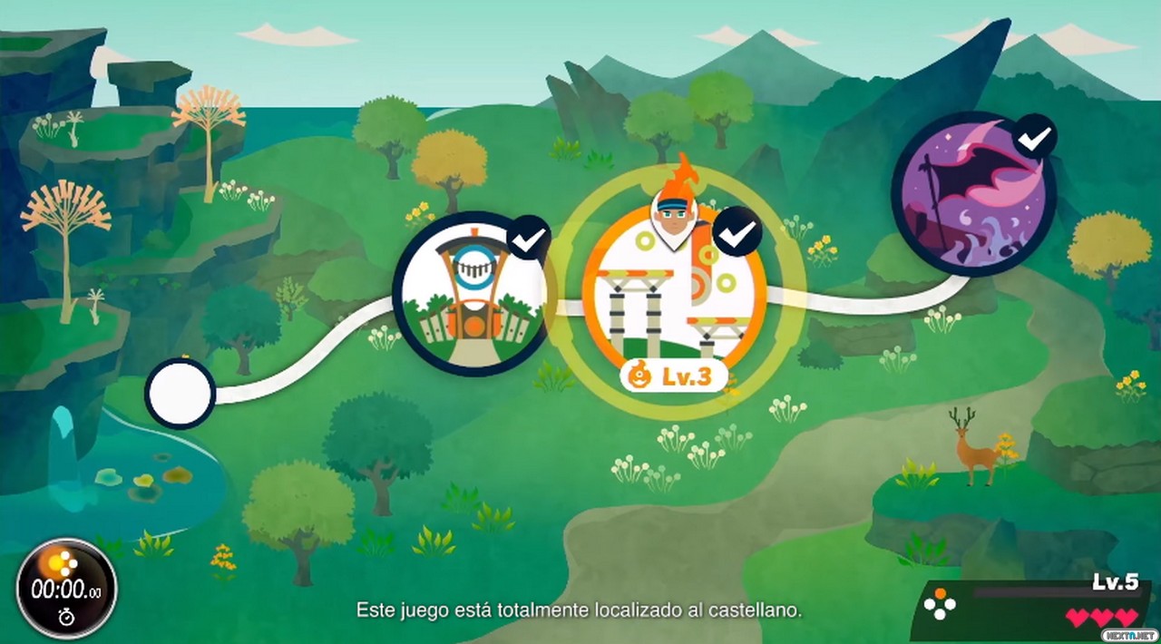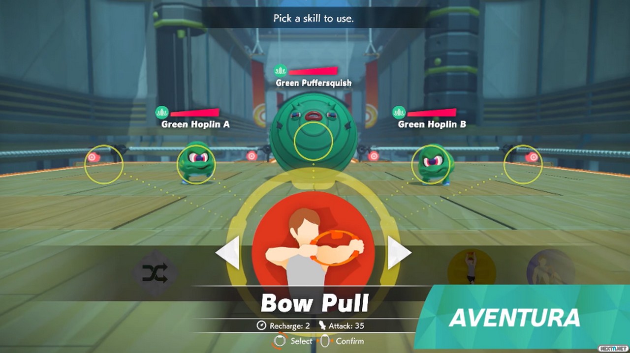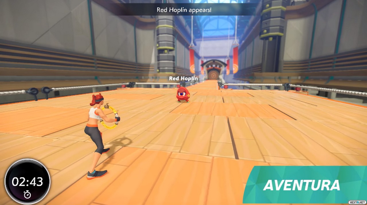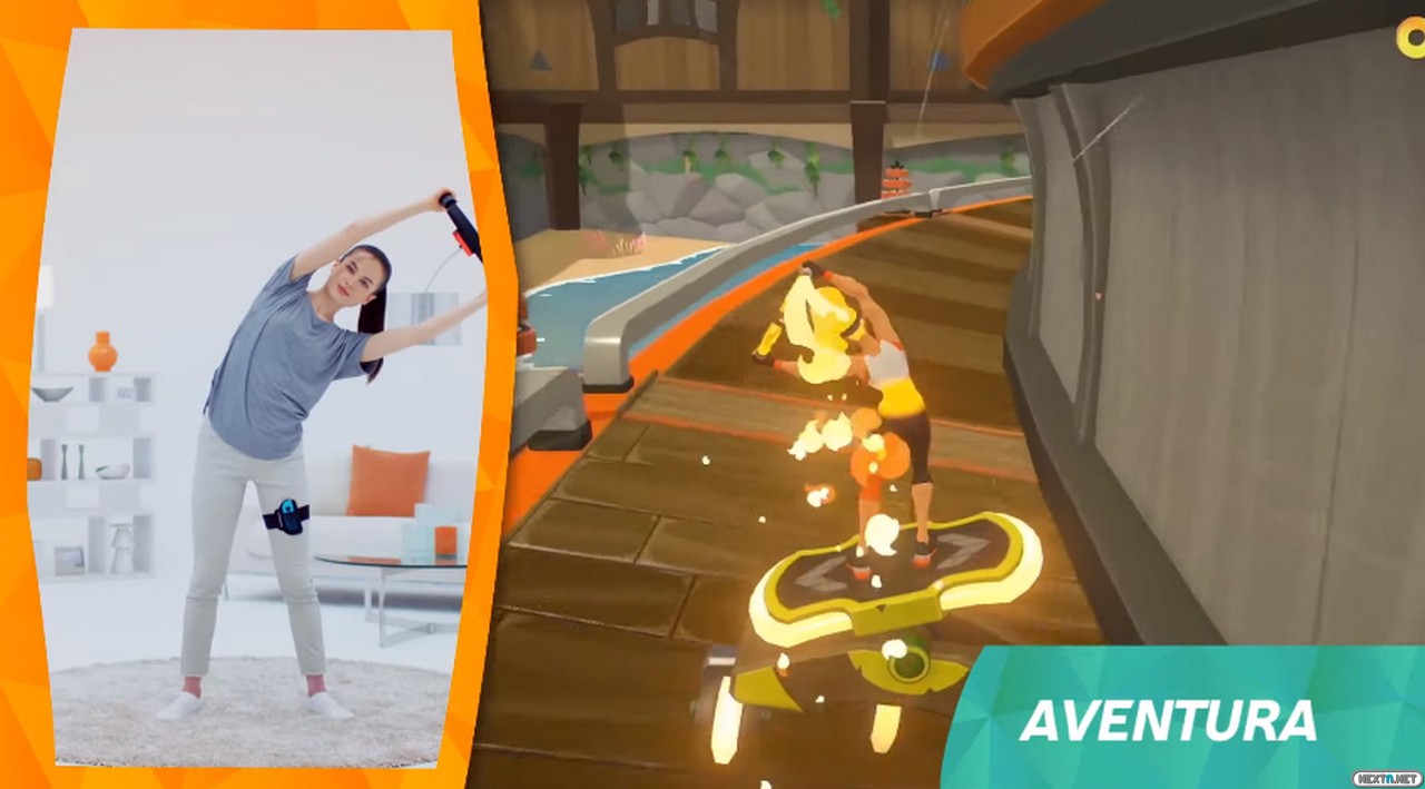 Para caminar hacia adelante en este modo aventura tendremos que correr en el sitio y podremos apretar el Ring-Con para disparar aire comprimido. ¡Tendremos que remar, propulsarnos e incluso volar en este mundo! Además, también nos enfrentaremos a enemigos que se interpondrán en nuestro camino y lo haremos gracias a combates de fitness y a las más de 40 habilidades que podremos aprender, las cuales se agrupan en cuatro categorías: rojas (emplean los brazos), amarillas (emplean el tronco), azules (emplean las piernas) y verdes (inspiradas en ejercicios de yoga). El color de los enemigos indica qué tipo de habilidad debemos usar contra ellos, así que no basta con usar una al azar, sino que tendremos que pensar cuáles son las más adecuadas, y si las realizamos bien, ¡haremos más daño a los enemigos! Así, ganaremos experiencia y subiremos de nivel.