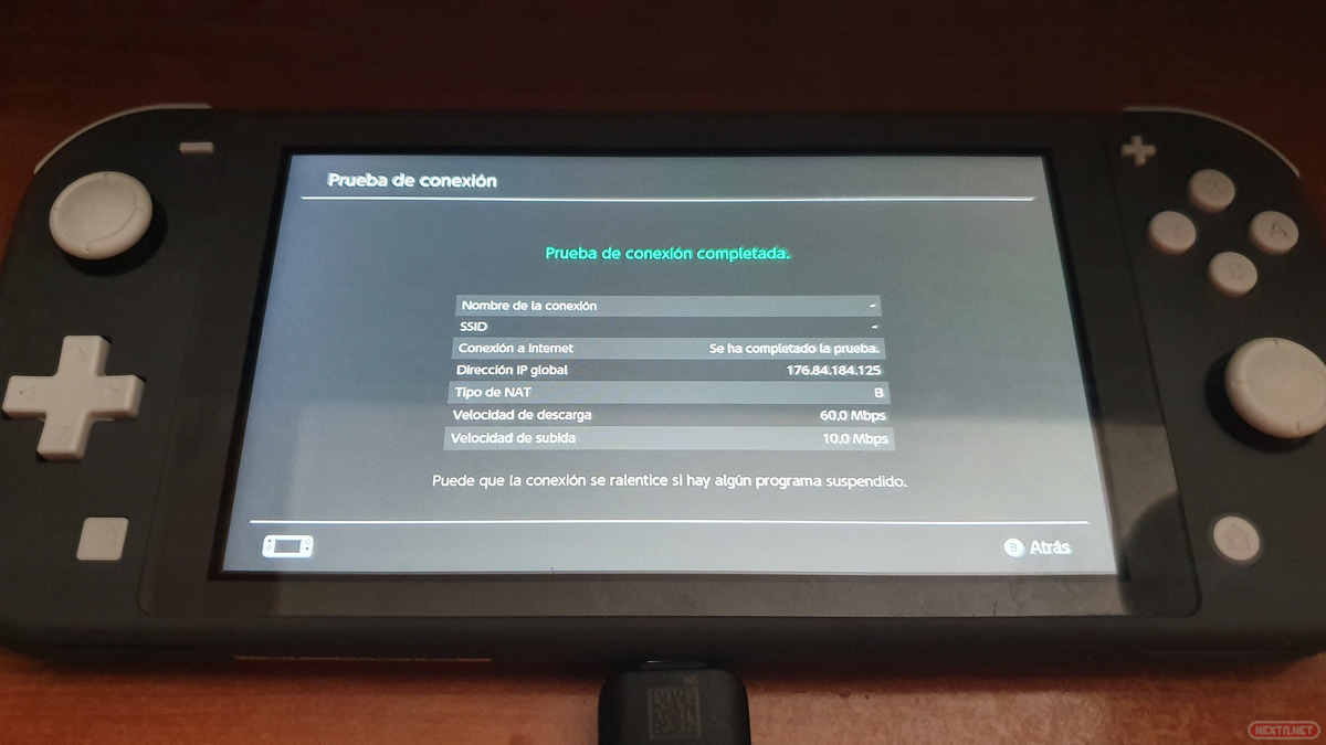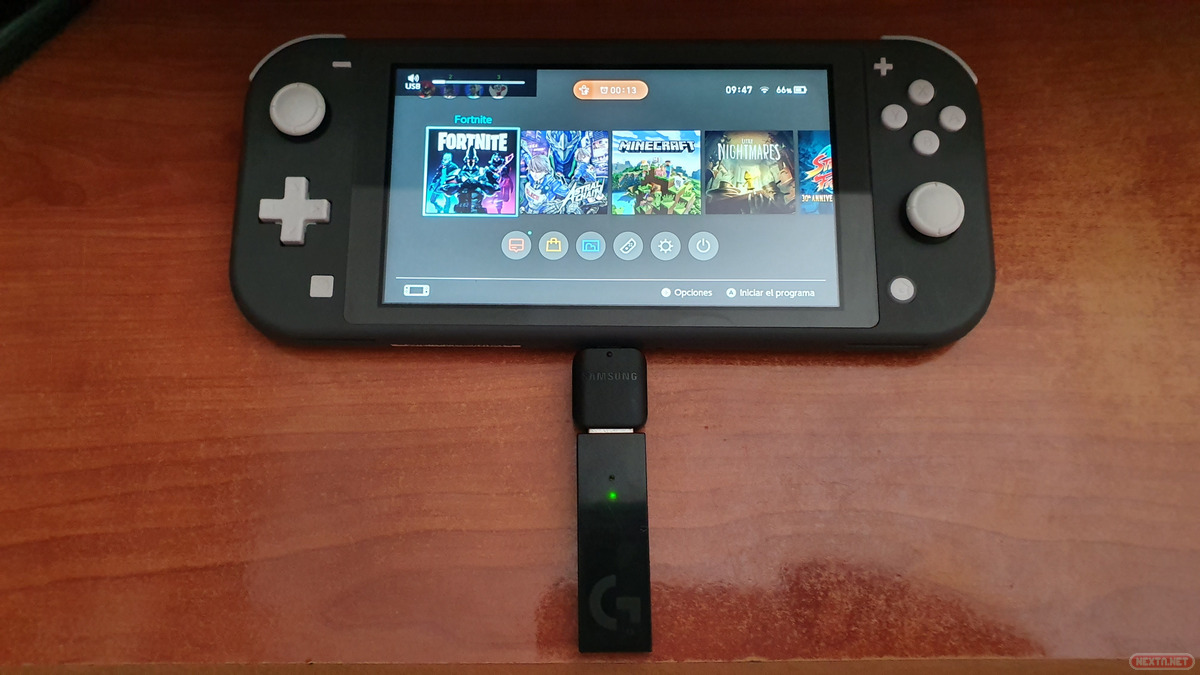 - Dispositivos USB: Nintendo Switch Lite es compatible con teclados USB por medio de su conector de carga. También puedes confirmar que podrás hacer uso de módems USB para conectar la consola directamente al router, pues lo hemos probado con resultados satisfactorios. Obtendrás una mayor estabilidad en tu conexión, en algunos casos incluso velocidad, sacrificando portabilidad a causa de tener que estar conectado cerca de una toma de red, mientras que tampoco podrás cargar la energía de tu Lite, dado que se usa el mismo puerto (en el caso de la consola clásica, conectamos el módem a uno de los tres puertos USB del Dock). De todas formas, si cuentas con una buena cobertura Wi-Fi, este accesorio es totalmente prescindible, pero no está de más saberlo. Como decíamos en el apartado de sonido, también es compatible con auriculares inalámbricos de receptor USB, si este dispone de conexión USB C1, o bien si contamos con un adaptador para conectarlo. En definitiva, todos los accesorios que hemos probado que pueden conectarse a Nintendo Switch por USB, funcionan en Lite si se conectan a su puerto USB C1, incluso con un adaptador.