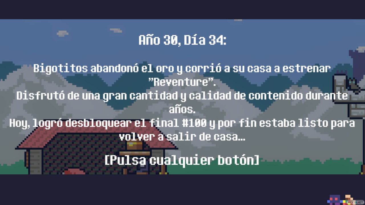 El estudio malagueño Pixelatto, formado por apenas cinco miembros, tocó el cielo el año pasado con Reventure, un juego muy pequeñito que subió a la lista de los más vendidos en Steam (impulsado, en gran parte, por las buenas reacciones de los youtubers más populares). Ahora, el juego llega a Nintendo Switch para proponernos un high concept de lo más original: el juego no tiene un final per se, sino cien finales diferentes, y encontrarlos todos será el verdadero objetivo del juego. Con un estilo pixel art que deja casi todo a la imaginación, el desarrollo tiene lugar en un mapa 2D mucho más grande de lo que aparenta, y prácticamente sin pistas de hacia dónde ir o qué hacer. Todo se revela a base de experimentación, de utilizar los objetos que vamos encontrando y buscar las numerosísimas rutas secretas. Cada camino te descubrirá una nueva zona con varias rutas para seguir, que te retarán con nuevas decisiones: ¿seguir por donde tenía pensado o explorar esta nueva ruta? Antes de que te des cuenta, lo más seguro es que acabes muerto… lo que significa un nuevo final para la galería.