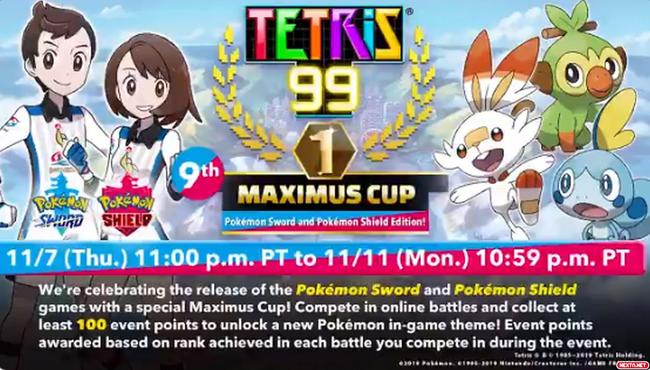 Before you set off on your grand adventure in the Galar region, play in this special #PokemonSwordShield themed #Tetris99 MAXIMUS CUP! Earn at least 100 event points to get this custom theme. @Tetris_officialhttps://t.co/jrWEmtmcey pic.twitter.com/vsupyEejoF