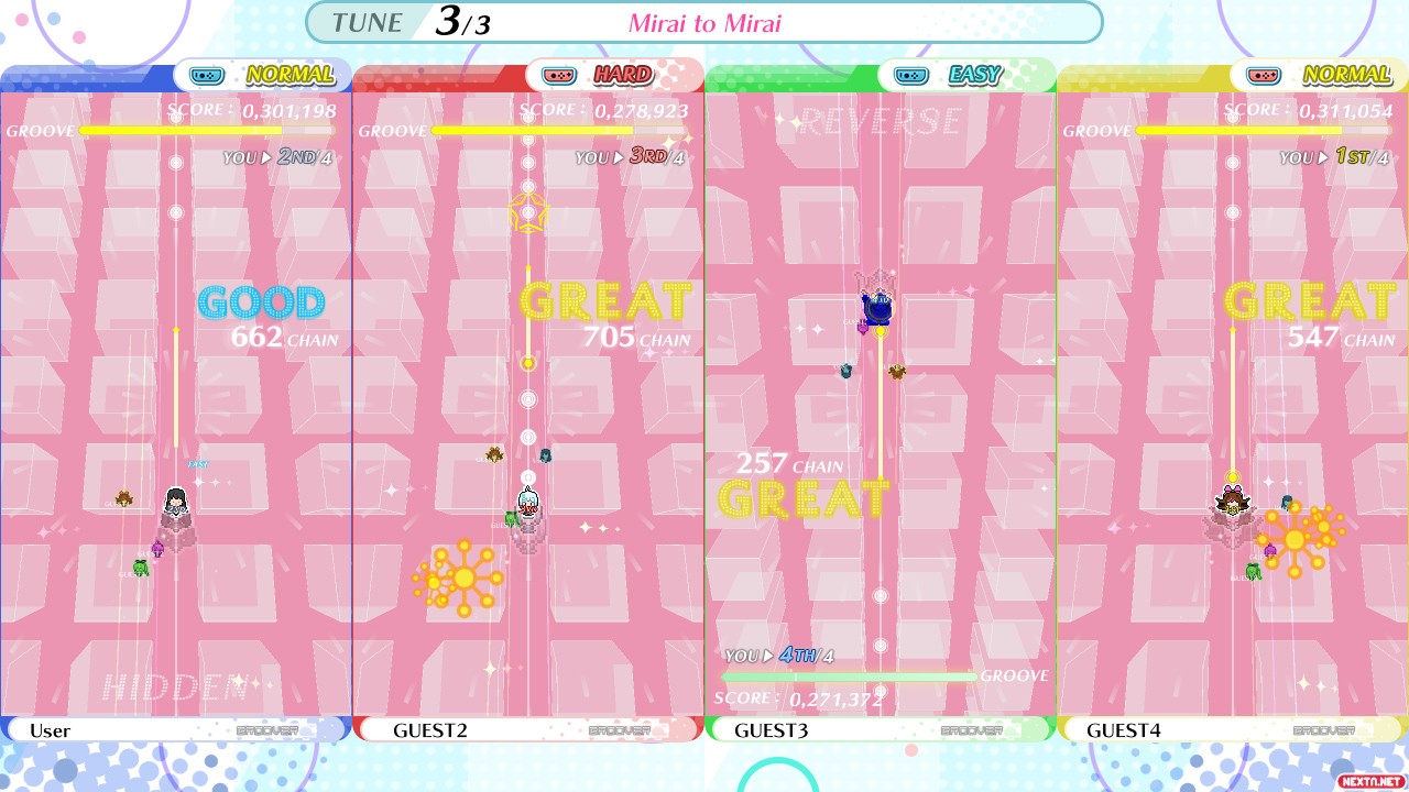 Donde sí se pueden comparar puntuaciones es en la parte de party que aparece en el nombre de Groove Coaster Wai Wai Party!!!!, un modo multijugador con el que ver quién es le rey de la montaña rusa otaku con hasta tres amigos más. Destacar, además, que en este modo vemos en todo momento sobre el carril al resto de jugadores, para ver «cómo de bien lo van haciendo». Merece la pena comentar que todas las opciones de personalización, tanto visuales como de dificultad, se mantienen, pudiendo adaptar la experiencia a todos los niveles de jugadores.