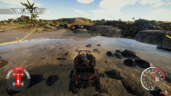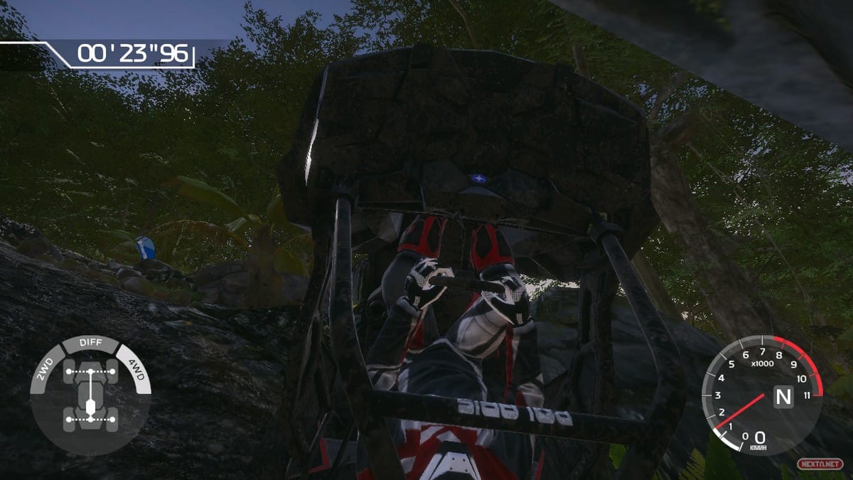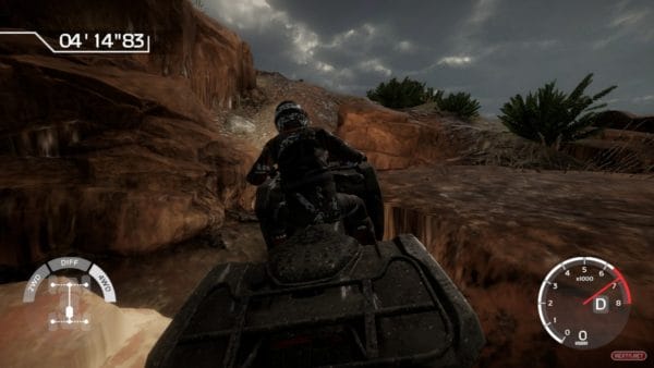 Y es aquí, precisamente, donde Overpass muestra su punto fuerte, ya que dicha exigencia se gestiona a través de una experiencia bastante realista (y no hablo de su aspecto gráfico) en la que el tipo de terreno, los obstáculos y los desniveles son parte indisoluble de esta propuesta que aúna conducción y una encarnizada lucha contra un apabullante, y bien recreado, sistema de físicas. Nuestros vehículos, como no podía ser de otra forma, nos presentan distintos modos de conducción. Mientras el buggy nos da la posibilidad de usar el bloqueo diferencial (además de 4×4 y 2×2) para salir airoso de terrenos embarrados y escarpados llenos de obstáculos (naturales y artificiales), el quad nos permite cambiar la posición del conductor para redistribuir el peso. Algo que ayuda a potenciar la sensación de que solo conociendo las posibilidades de nuestros vehículos y aplicándolas de forma inteligente a nuestro entorno vamos a lograr salir airosos.