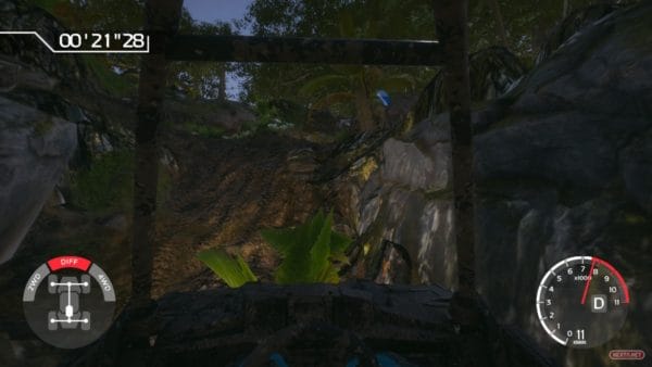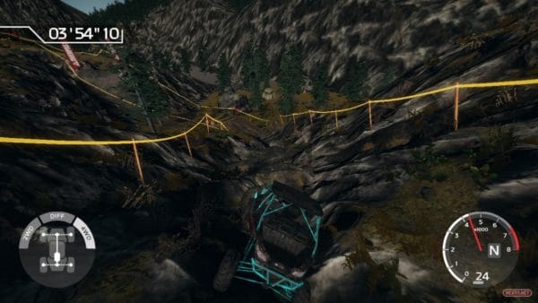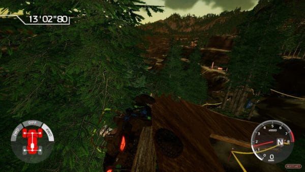 Derivado del realismo de sus físicas y de sus altas exigencias como simulador, Overpass nos presenta una propuesta realmente demoledora. Es cierto que poder alternar entre los distintos modos de tracción y contar con tres cámaras diferentes a nuestra disposición, aporta un interesante toque estratégico. No obstante, hay que decirlo, es bastante sencillo caerse de nuestro vehículo o quedarnos atascados en posiciones realmente extremas. La solución aquí pasa por reiniciar desde unos metros más atrás. En caso de salirnos del terreno acotado del circuito, el reinicio es automático; en caso de quedar atascado, basta con mantener apretado el botón para reaparecer. Por desgracia, en bastantes ocasiones hemos aparecido en zonas que nos obligan a retroceder para poder superarlas (como por ejemplo grandes desniveles) o incluso, esto nos ha ocurrido un par de veces, tras reaparecer nos hemos encontrado en un bucle en el que nuestro vehículo no para de rodar, obligándonos a reiniciar el circuito desde el principio. Y es que en Overpass hemos descubierto el significado, literal, de la expresión morder el polvo. Nuestra batalla contra el entorno, ya sean elementos naturales (desniveles, piedras, etc.) o artificiales (troncos, ruedas, puentes, etc.), es constante, requiriendo un nivel de atención total y obligándonos a afrontar estratégicamente cada incursión para que los distintos obstáculos no dañen demasiado nuestra maltrecha carrocería. Por si fuera poco, en un título en el que cada segundo vale oro, se nos penaliza (sumando tiempo) cada vez que no superamos determinadas prueba situadas en puntos estratégicos de los circuitos, acotadas por dos banderas rojas, o cuando tiramos un cono o rompemos las cintas que delimitan nuestro trazado.