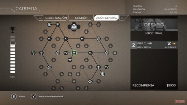 Overpass nos presenta un amplio surtido de modos de juego que van desde Modo Carrera, Carrera Libre, Desafío Personalizado o Multijugador (tanto online como a pantalla partida). No obstante, sin lugar a dudas, la piedra angular de este título es, precisamente, el primero de ellos. El Modo Carrera abre ante nosotros un mapa con dos tipos de pruebas: Desafíos (competiciones de una o más vueltas) y carreras con recompensa (desbloquean vehículos, mejoras y equipo para nuestro piloto). Sin olvidar un tutorial que nos ha venido de lujo durante nuestros primeros minutos de juego y que podemos repetir tantas veces como queramos. En esta modalidad nos toca competir contra otros pilotos en una especie de torneo, compuesto por casillas, en el que nos toca darlo todo para conseguir desbloquear mejoras (disponibles posteriormente para su compra en el garaje) y conseguir dinero, aceptando retos o superando carreras (40 repartidas en 6 entornos bien diferenciados). Dinero que nos resulta tremendamente útil para comprar nuevos vehículos (contamos con más de 20 por desbloquear), mejorar los que ya tenemos o aceptar, previo pago, desafíos de otros jugadores. Por otro lado, el sistema de firma de contratos con diferentes patrocinadores nos permite lograr beneficios extra si logramos cumplir determinadas condiciones. Nuestro garaje (punto en el que comprar y mejorar los vehículos) también nos permite personalizar a nuestro piloto para que el barro no logre apagar todo su glamour.