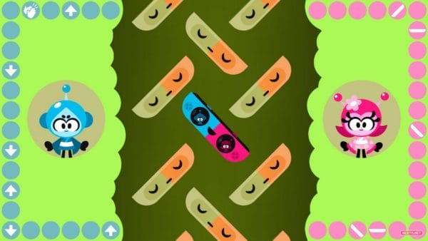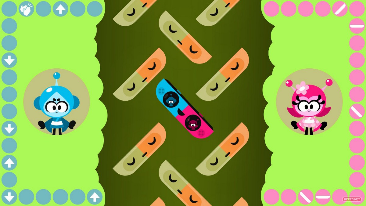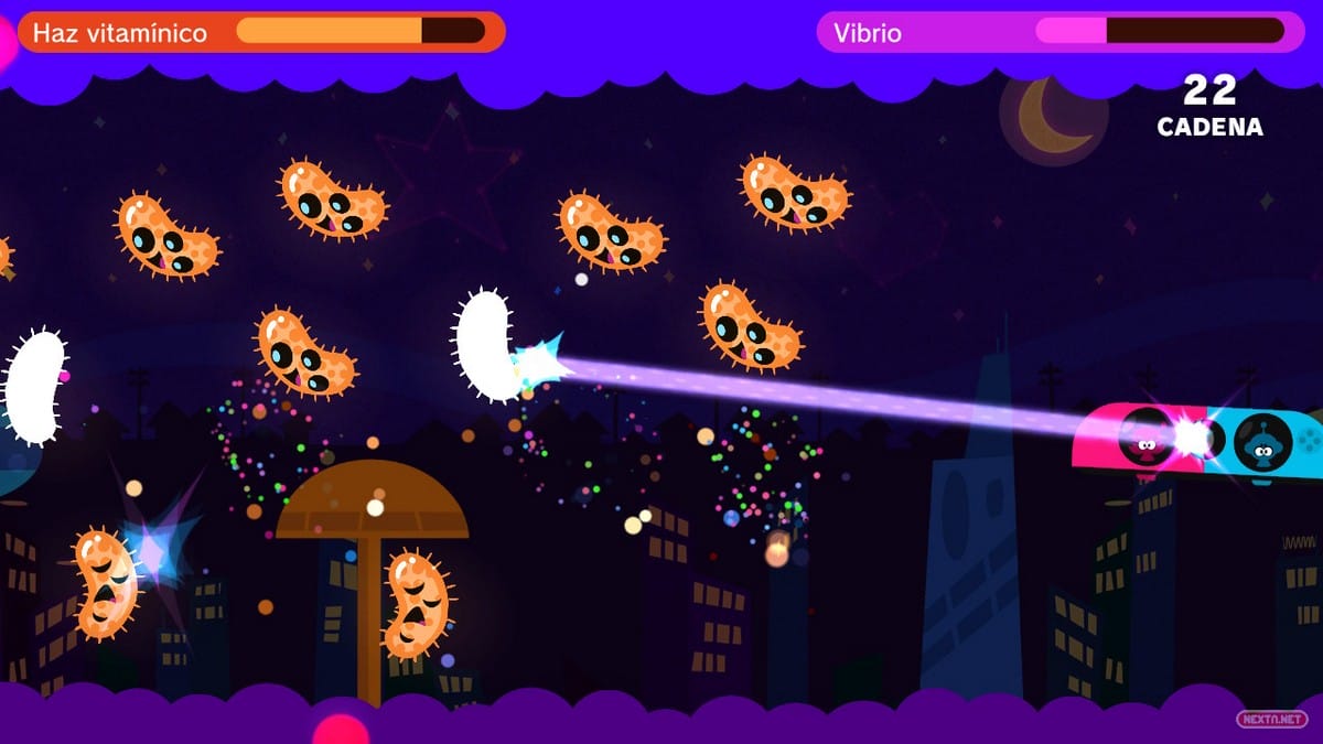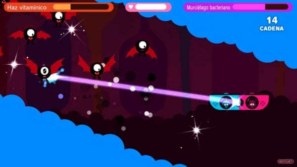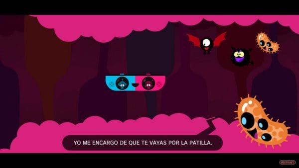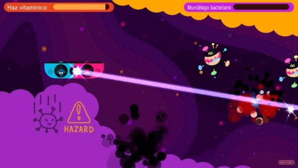Como podéis leer, la propuesta jugable de Vitamin Connection es tan simple como adictiva, permitiéndonos tomar el control de Vita-Boy y Mina-Girl, copilotos de una microscópica nave con forma de Cápsula, cuya misión no es otra que defender a la familia Sable de una invasión patógena. Llegados a este punto, y antes de adentrarnos en sus curiosas mecánicas, conviene desgranar un aspecto que es parte misma de su esencia… sus diferentes «formas de jugar». Y es que además del juego en solitario, que no deja de ser divertido, donde Vitamin Connection realmente conecta, valga la redundancia, con nosotros es en su modo cooperativo local asimétrico. Un modo en el que cada jugador se hace con un Joy-Con para luchar mano, pie, boca… codo con codo contra la amenaza vírica. Si en solitario todo depende de la habilidad de un solo jugador, en el modo multijugador la tarea es compartida. Y es que mientras un jugador maneja los disparos (llamémoslo haz vitamínico) y el movimiento de la propia nave, el otro se encarga de la rotación de la cápsula. Además, cada jugador puede aumentar el ritmo de juego (hasta 2X), debiendo evitar chocar con las paredes para no perder vida. Vida que, todo dicho de paso, podemos recuperar recolectando diversos puntos brillantes escondidos en las paredes de las distintas cavidades por las que circulamos.